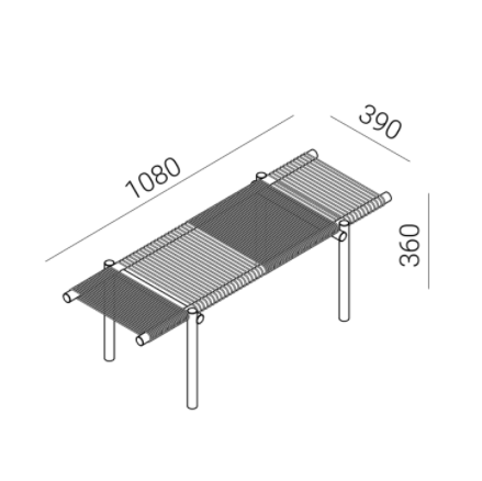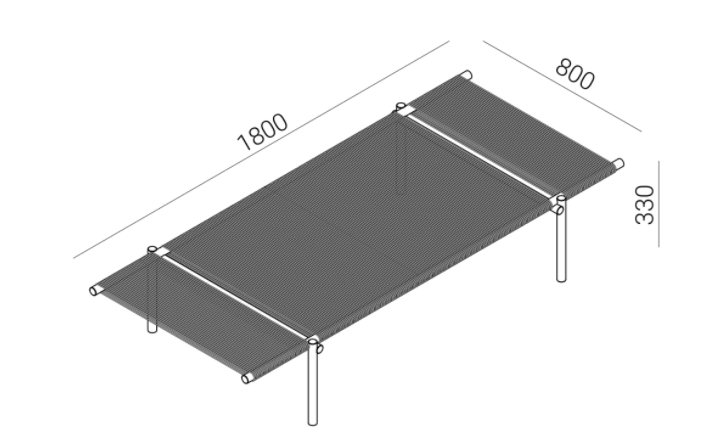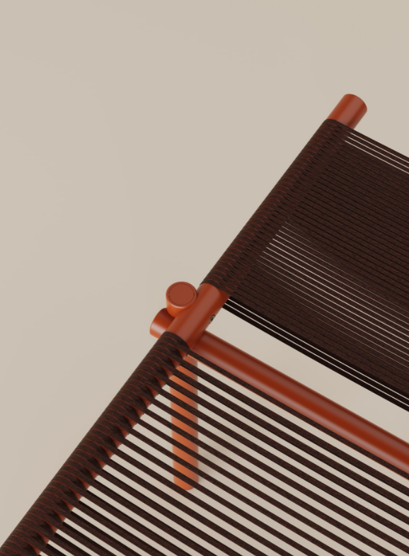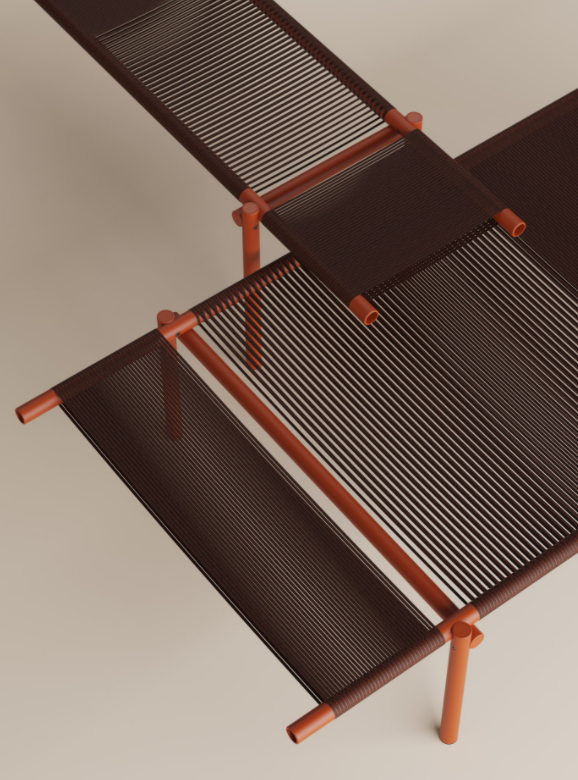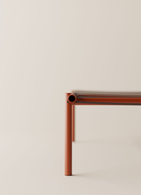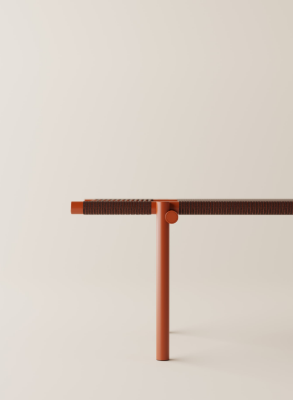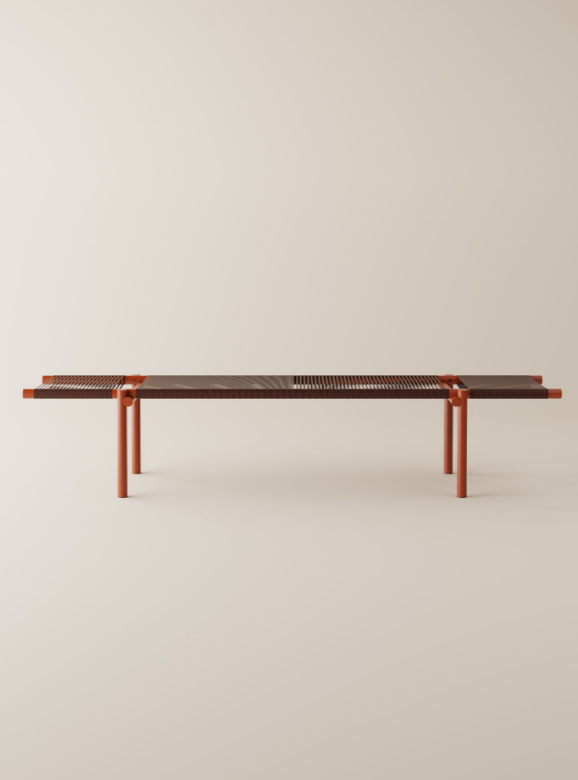 Three day-bed benches in three different heights can be used individually or stacked as desired, creating a space to sit, have a conversation, or stretch out and relax. The surface consists of hand-woven ropes of cork, with a technical metal core. The supports and frame are made of recycled aluminum tubing painted in a warm brick- red color. They are designed to be water- resistant, giving them a place in a home environment as well as in hotels and hospitality, even outside the bathroom or outdoors - the only limit is your imagination.