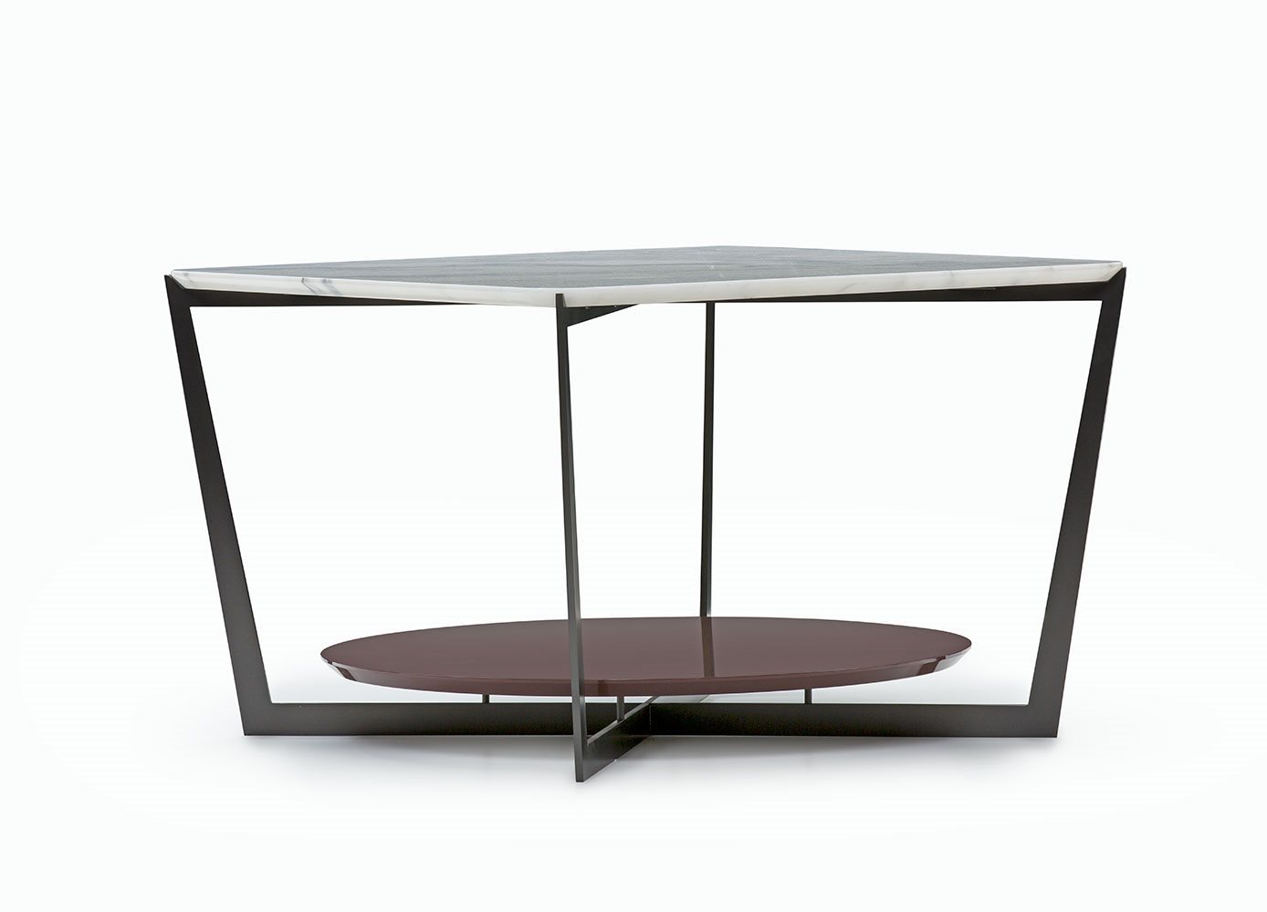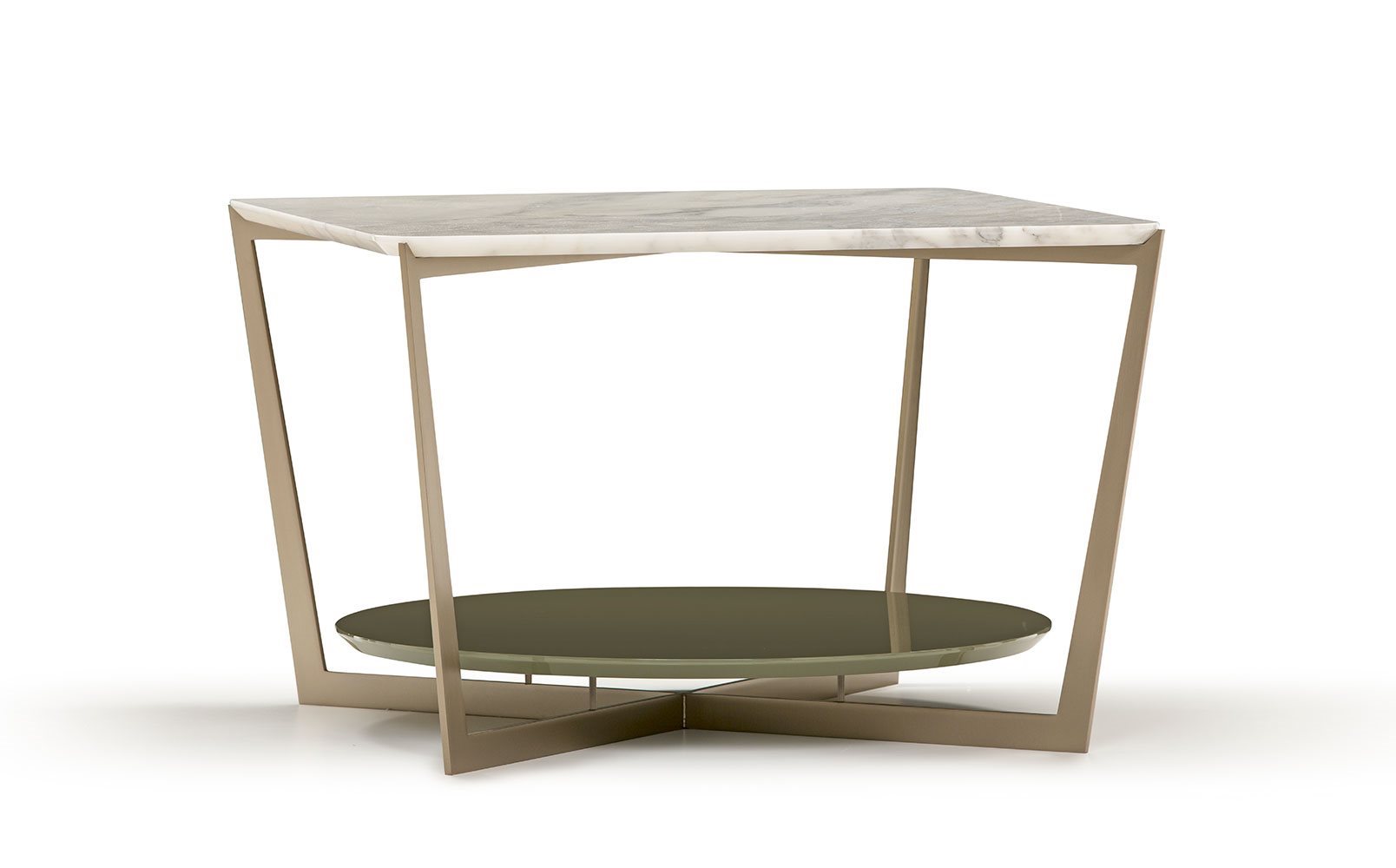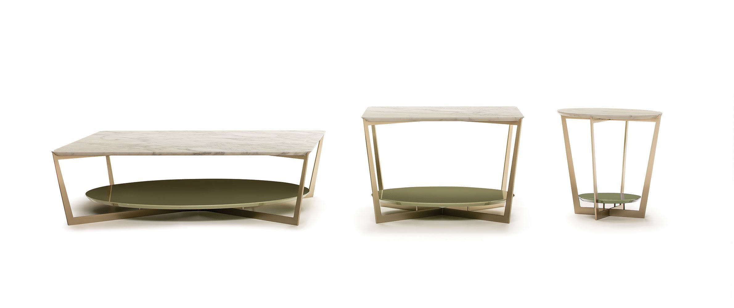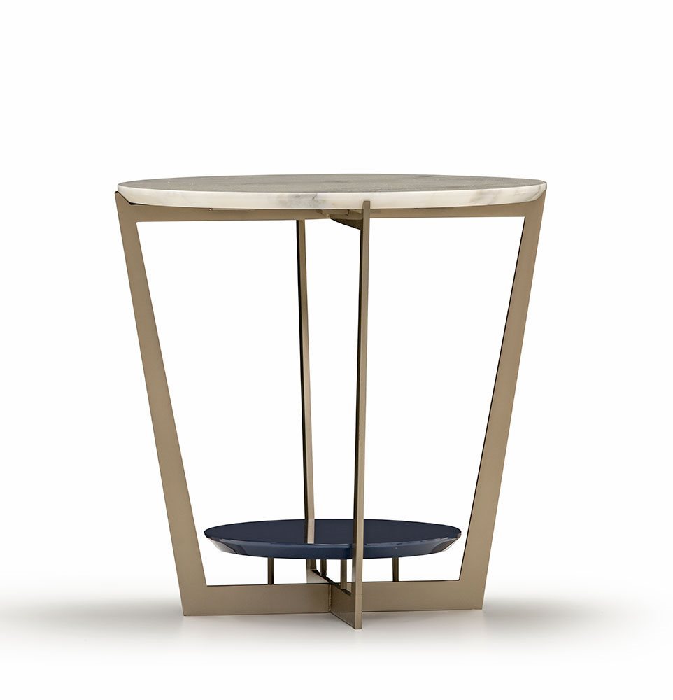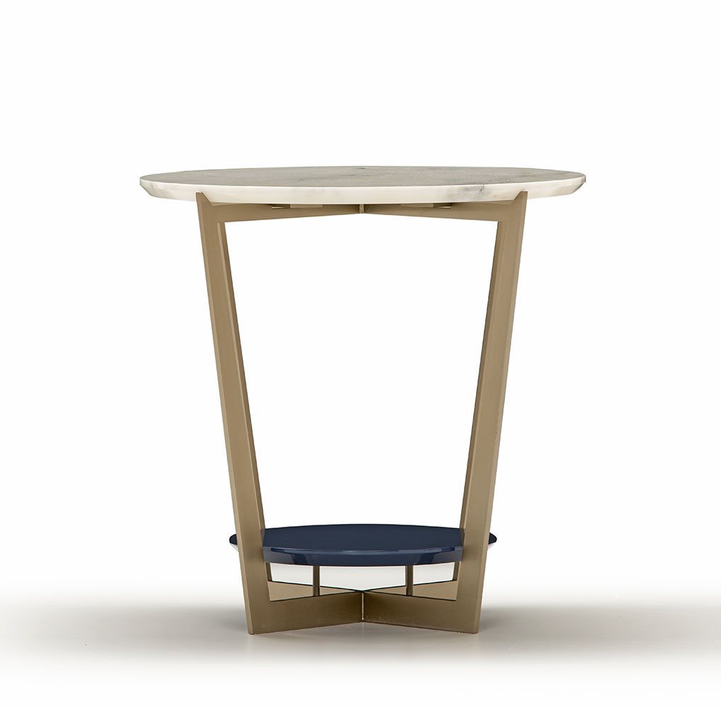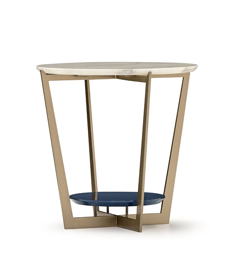Small tables. Structure: in metal. Structure finishing: French Bronze or Gun Metal. Top high (1): marble. Top low (2): MDF. Top low finishing (2): lacquered.
