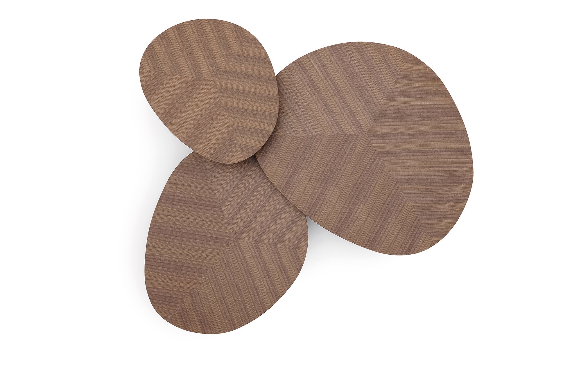 A soft design combined with graceful irregular lines are the leitmotif of the ISLAND side table collection. The wooden tops feature a precious inlay work that exploits the natural grain of wood to create a geometric design with a strong character. Available in 3 different sizes and heights, when used together, they create original layouts for your living room.