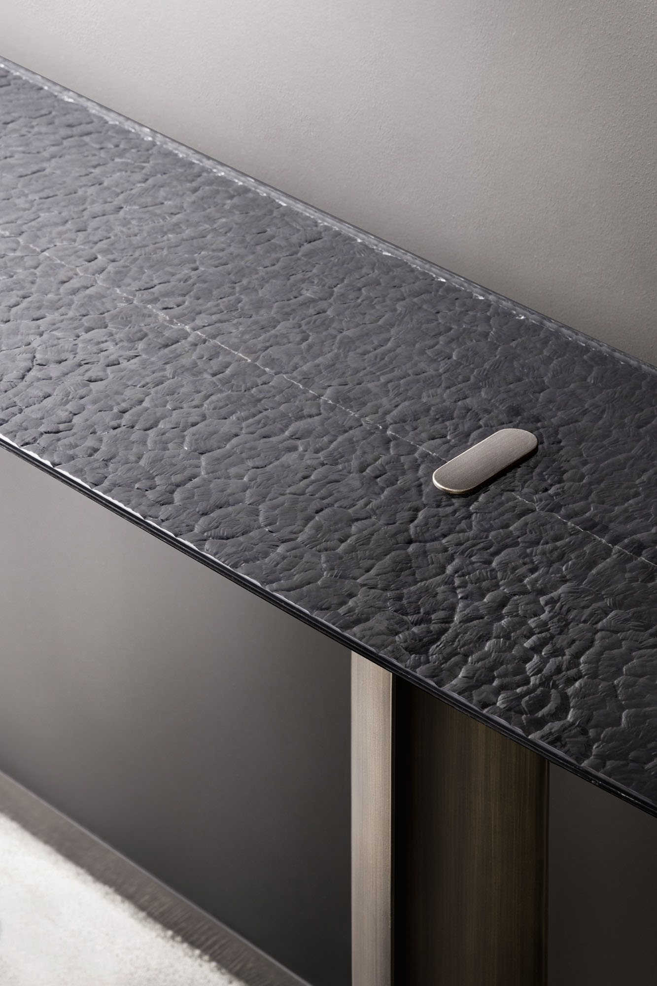Glass and metal combined create unexpected reflections that reverberate in the tables and in the console of the Premiere collection.