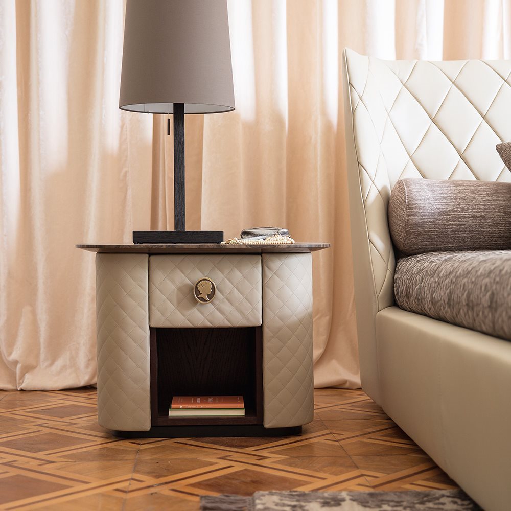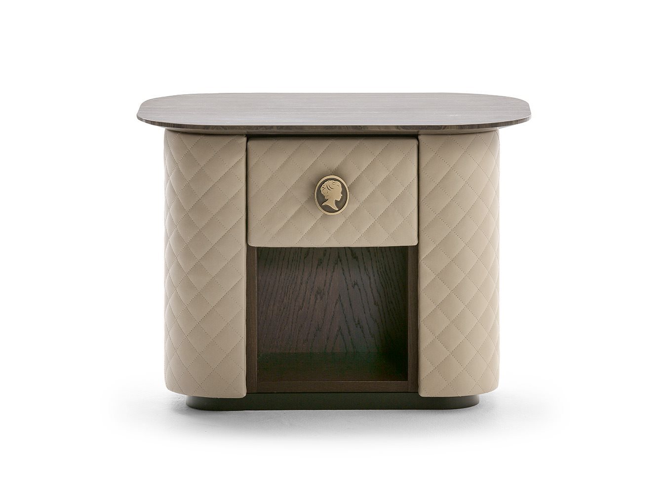 The high tailoring details distinguish the series of Penelope units. Drawer units and cupboards made with high fashion details, matching the best leather to the noble finishes and bright metal. Structure, doors and drawers are covered with diamond quilted leather, to give the entire range the elegant style typical of haut couture Italian leather work.