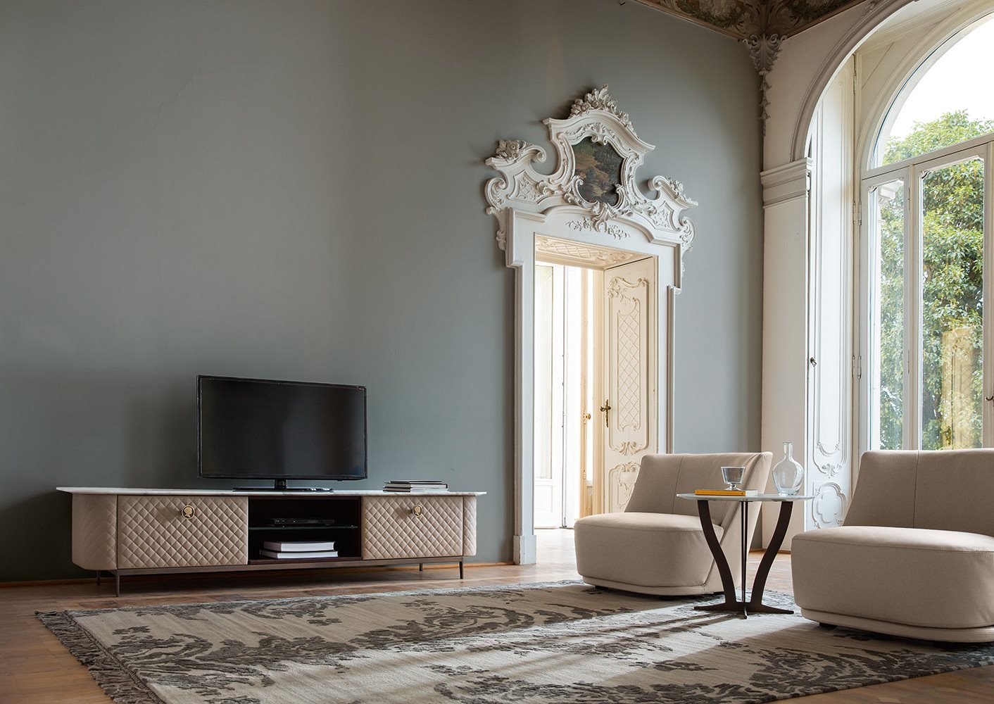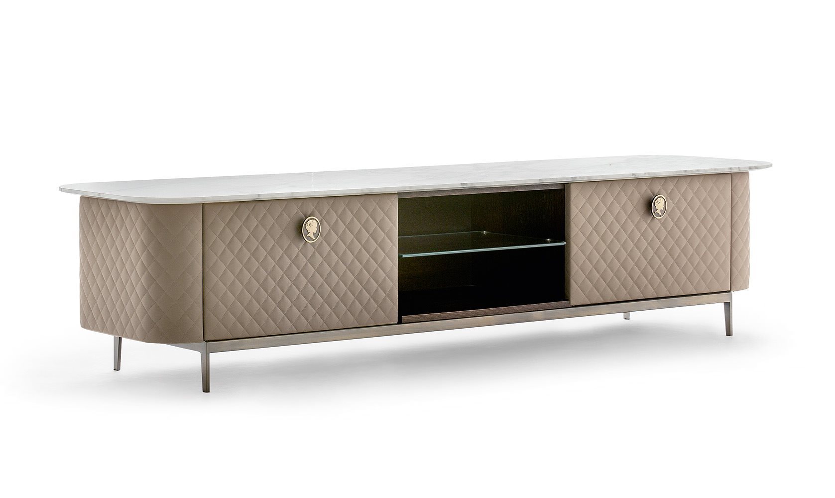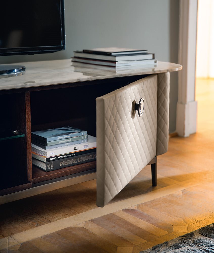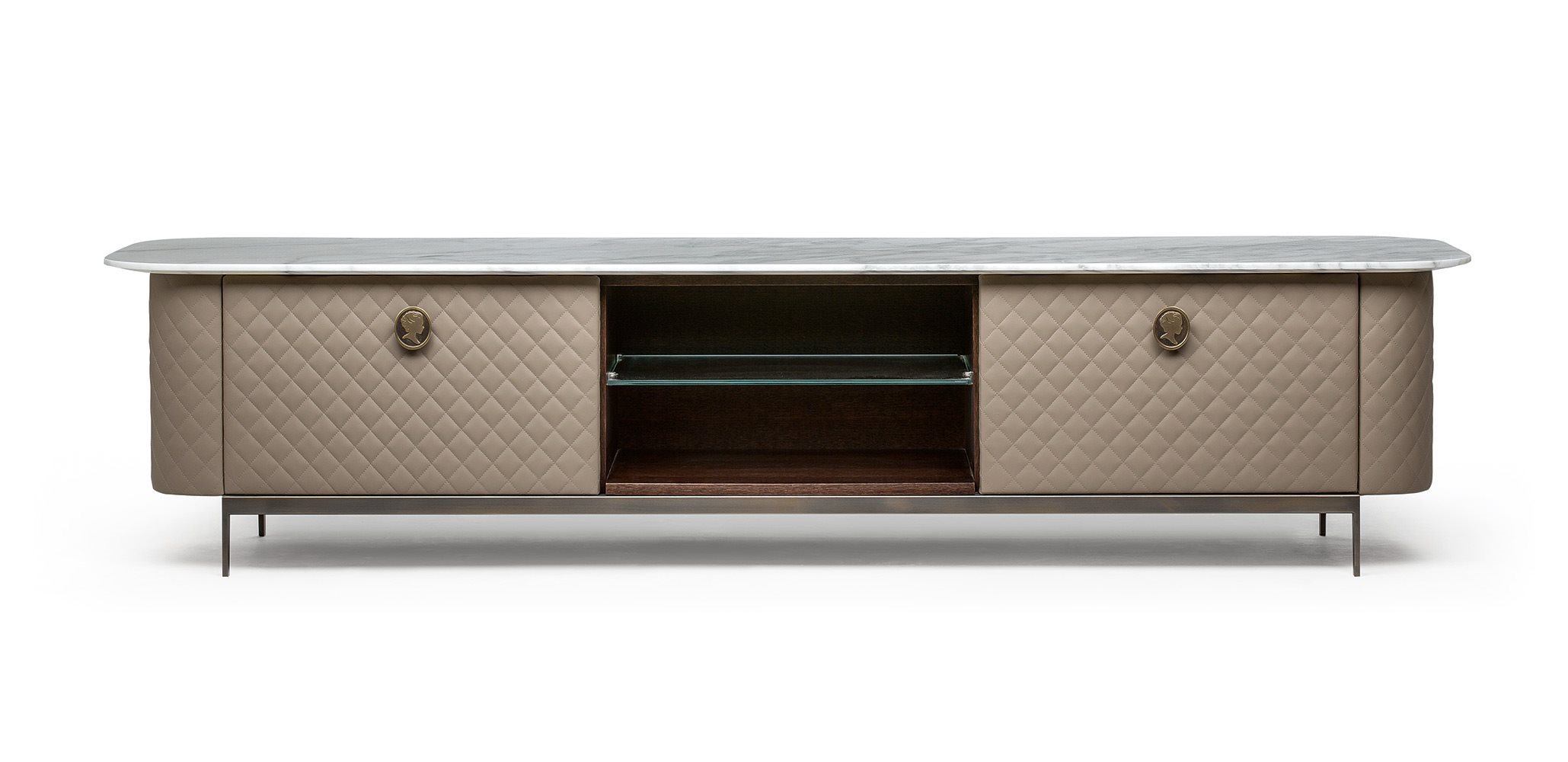 The high tailoring details distinguish the series of Penelope units. Drawer units and cupboards made with high fashion details, matching the best leather to the noble finishes and bright metal. Structure, doors and drawers are covered with diamond quilted leather, to give the entire range the elegant style typical of haut couture Italian leather work.