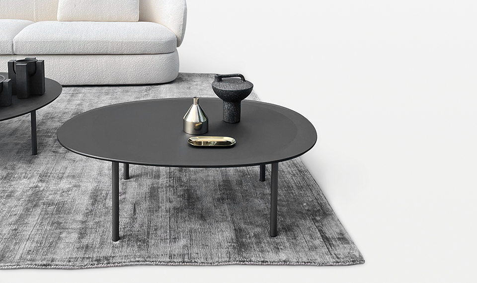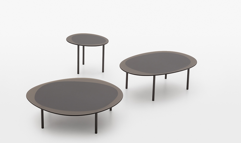 Tsuki is a range of occasional tables with a metal frame, tempered glass top and round satin-finish edge.