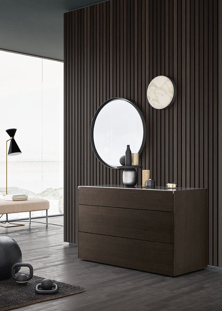 Disco mirrors, along with Esagona designer mirrors, look good in any room because of their frame in Moka Shine finish metal. The Disco model comes in three sizes.