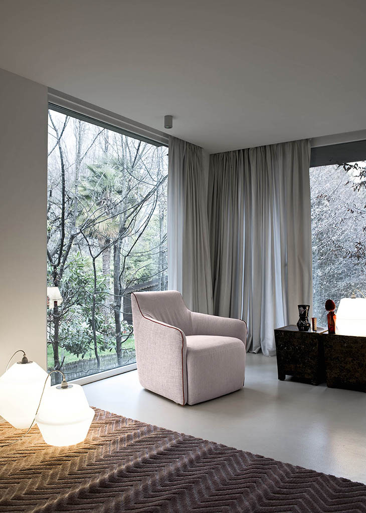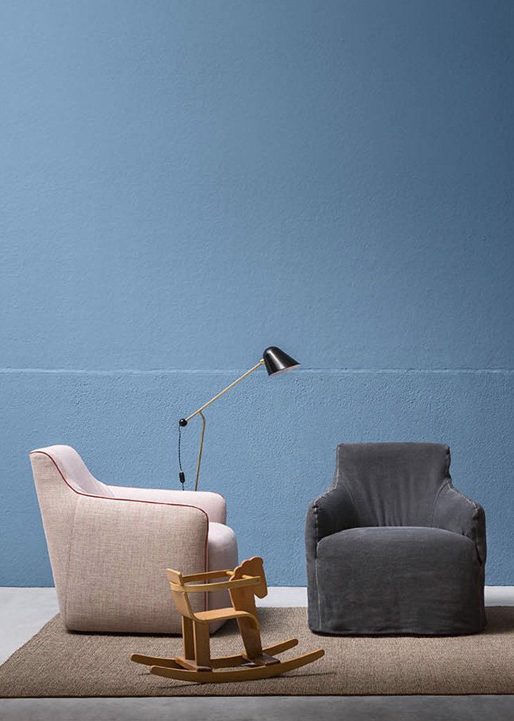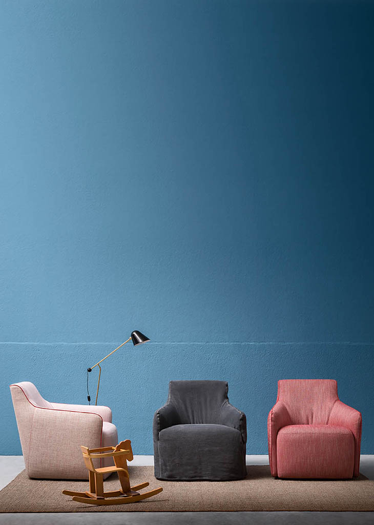Jet Set is a small upholstered armchair with removable cover (in the fabric and ecoleather version), which is available in models with feet, with swivel base and with valance. This armchair is distinguished by soft silhouettes which are emphasised by a contrasting border. The practical footstool is its perfect complement.