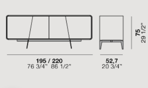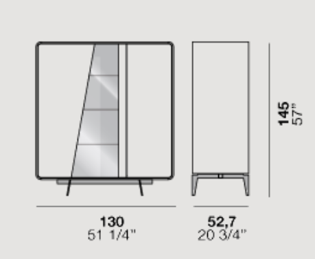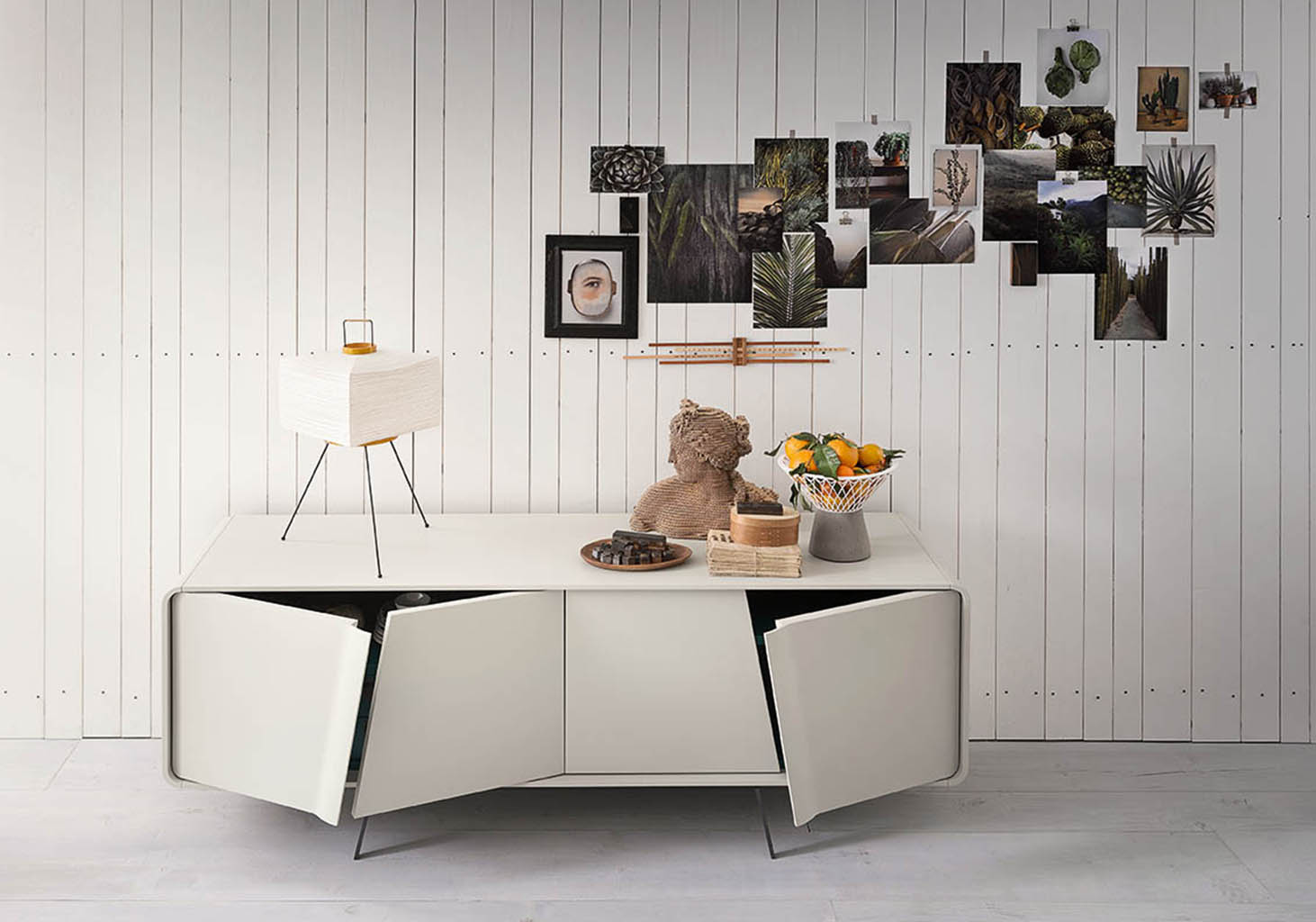 Musa is available as a sideboard, cabinet or display cabinet, and its main feature is the rounded shape of its carcass. It also stands out for the sloping cut of the doors that conceal the handle and continue in the lines of the painted metal feet. The interior can be lacquered and fitted – in the sideboard version – with a practical drawer unit.