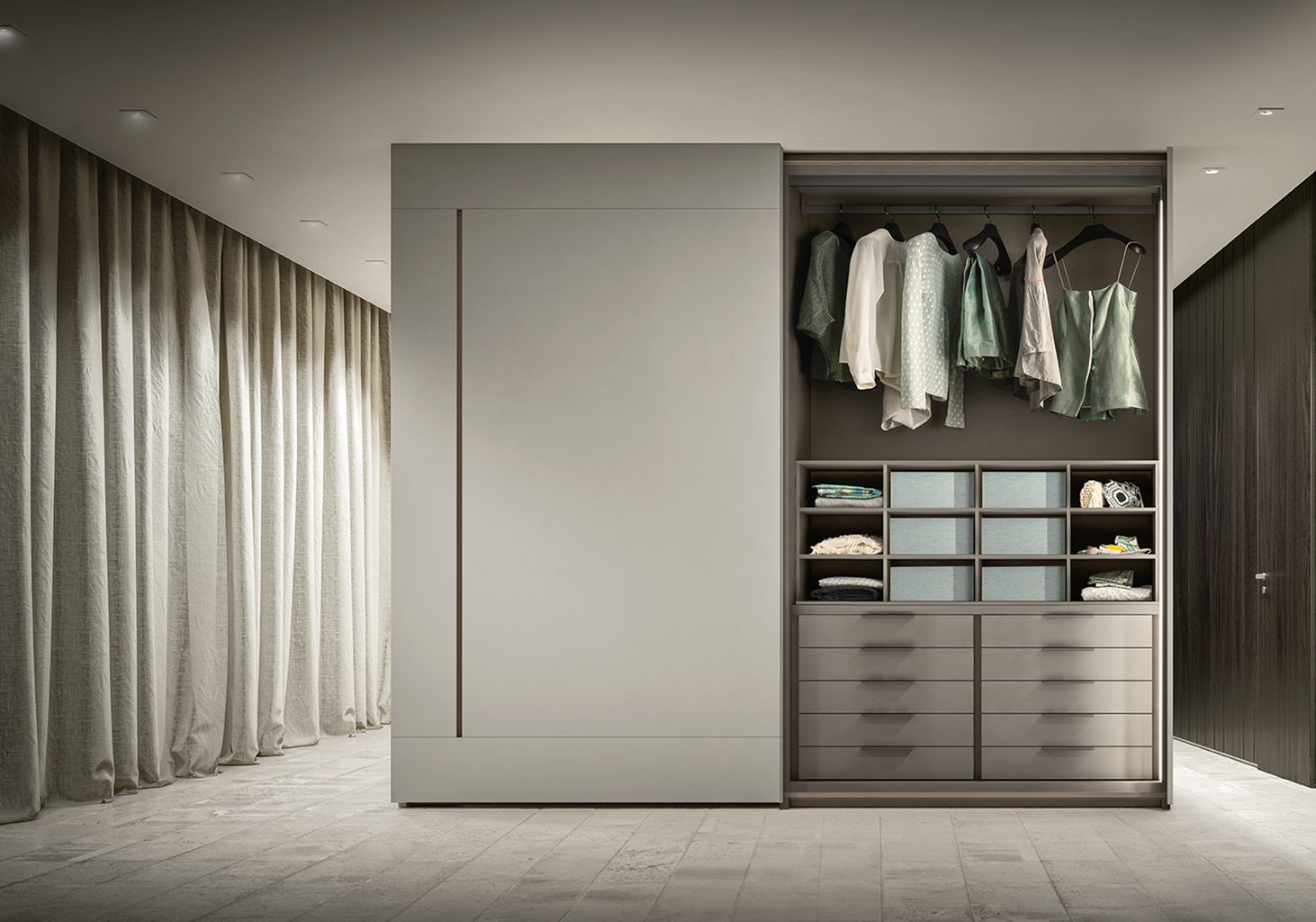 Glide is a coplanar wardrobe made up of several panels, whose combination creates the handle for opening.
