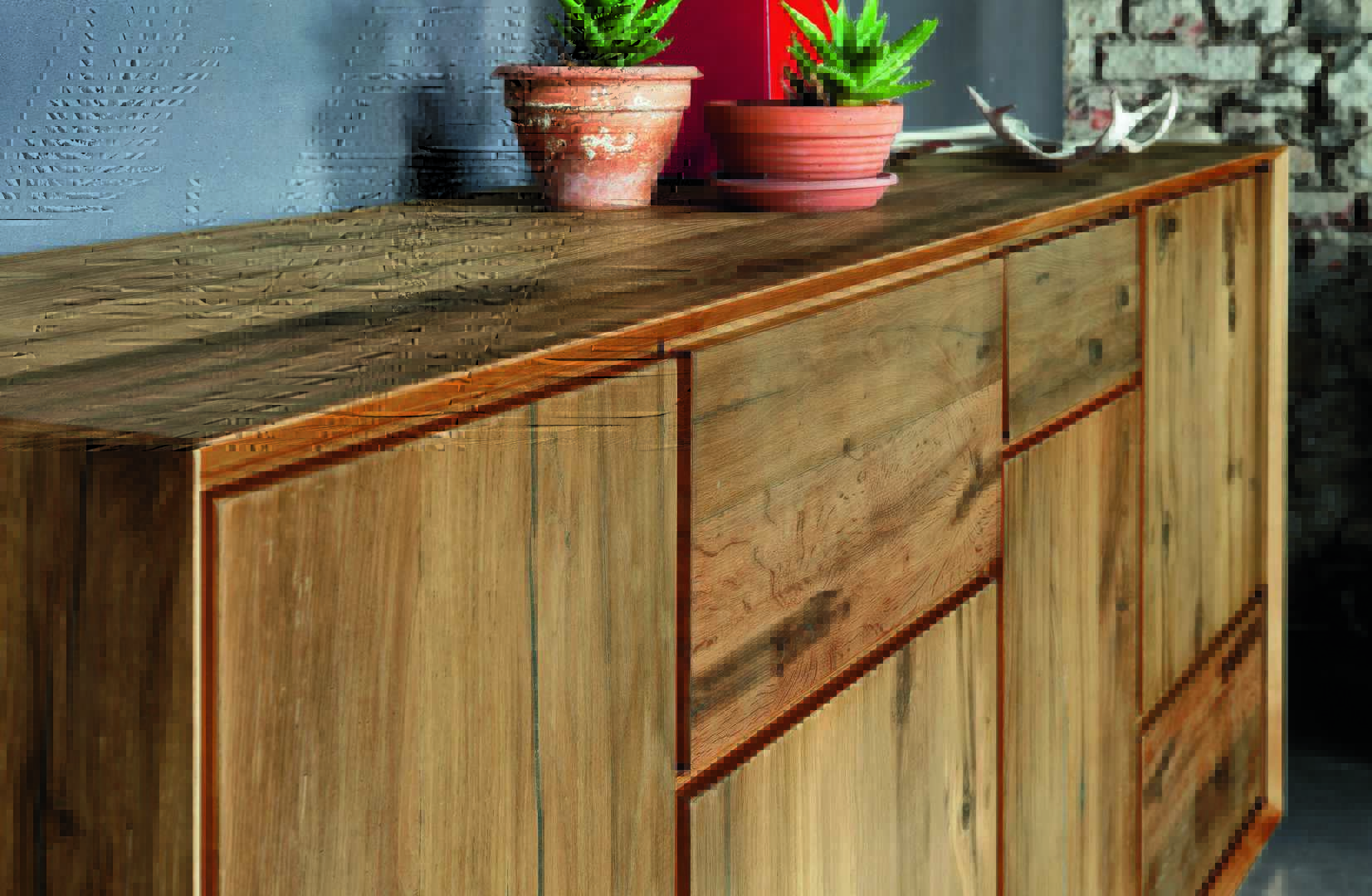Sideboard in Natural walnut finish with various compartments of different sizes.