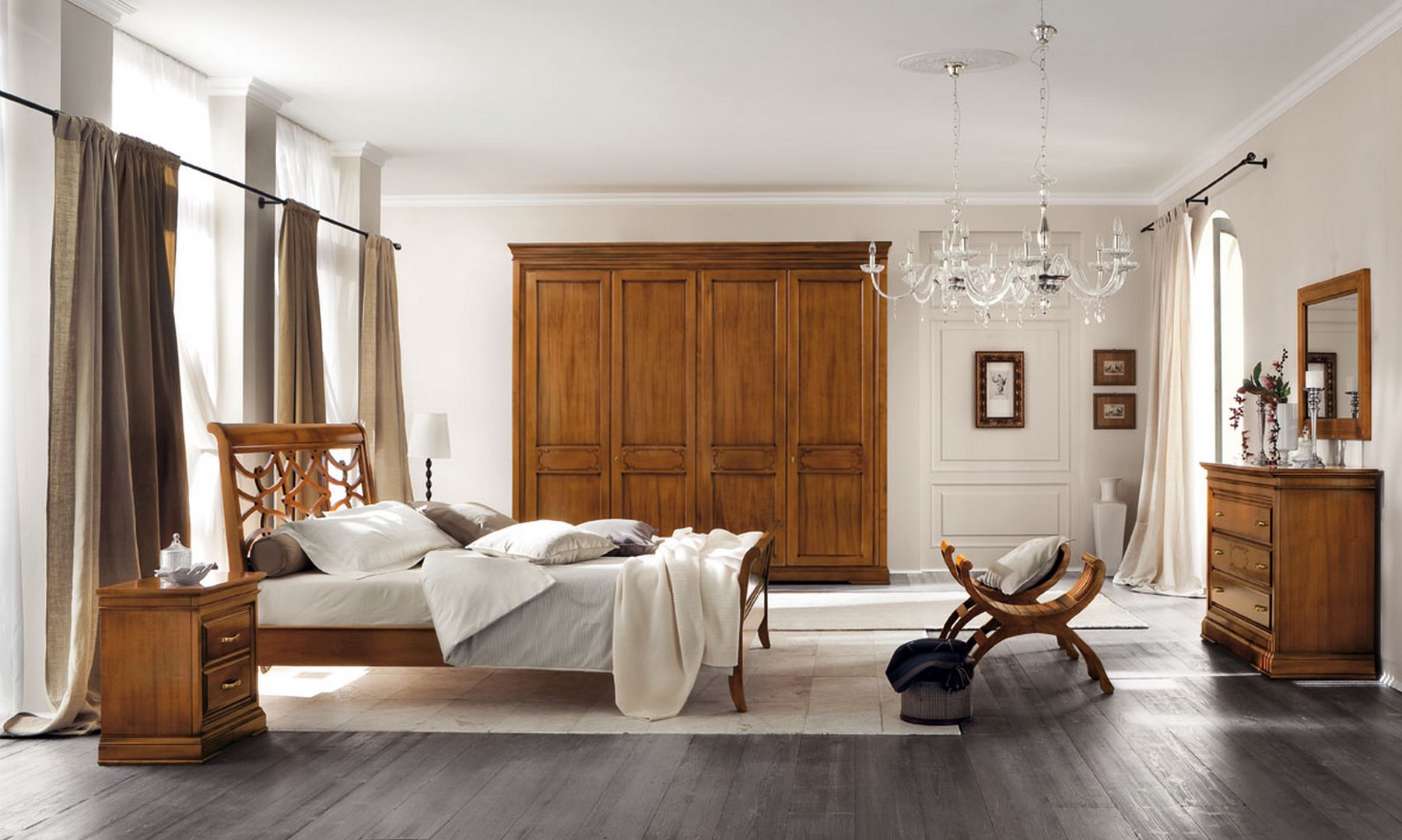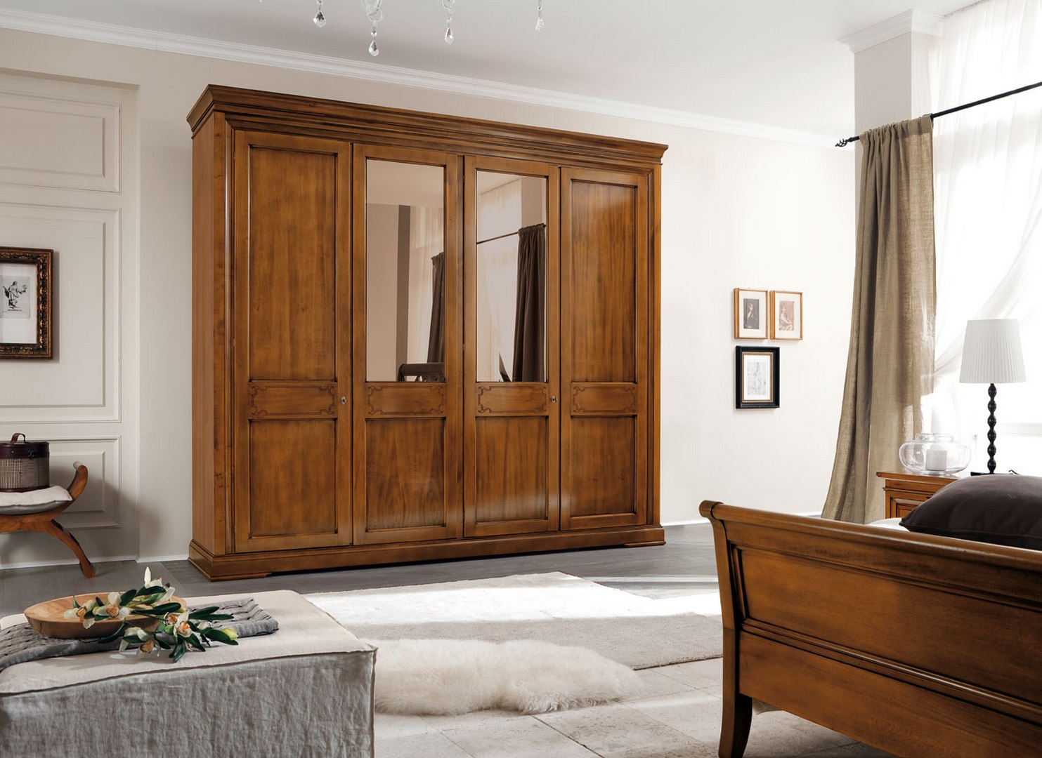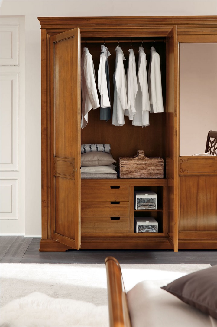 Wardrobe in limewood and tanganyika walnut, with four hinged doors decorated with the characteristic Margherita collection engraving and with lock; includes an interior set of drawers with top, shelf and three clothes rails.