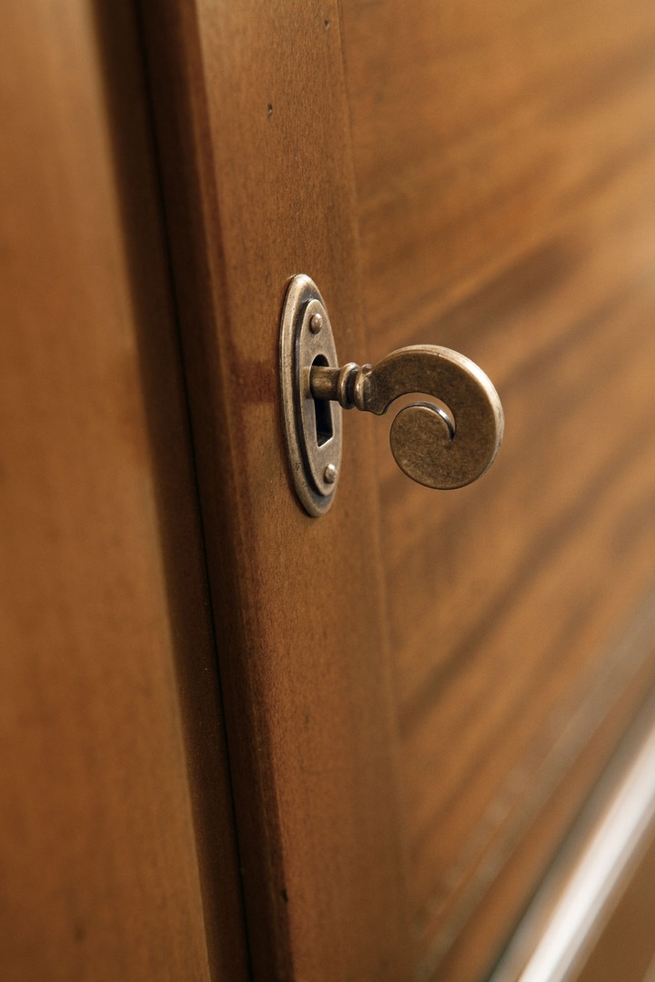 Sideboard in solid limewood, with wooden top, three exterior drawers and two hinged doors with lock; embellished with engraving on the doors and gilded handle.