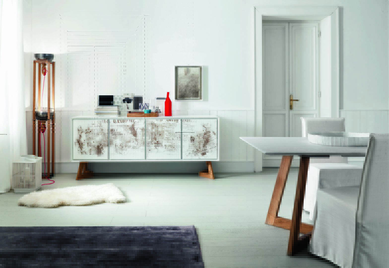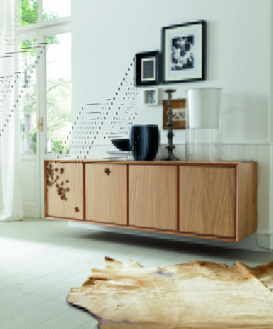 Nook unit with four hinged doors in Alaska oak finish. A LS4 laser etching is one of the various proposals of Altacorte collection, enriches the upper two doors.