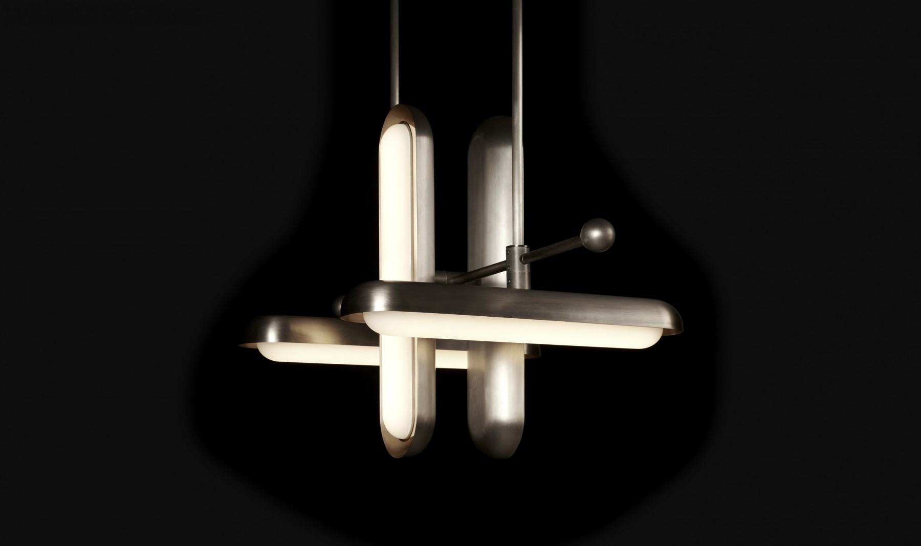 THE CIRCUIT SERIES CREATES RHYTHM WITH THE REPETITION OF PURE SHAPES. A GLOWING GLASS CAPSULE NESTS IN A BRASS SHADE, BECOMING A CONTAINED FORM THAT MULTIPLIES TO CONSTRUCT LARGER FIXTURES.