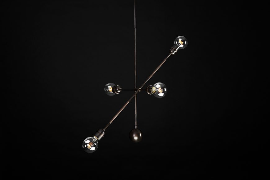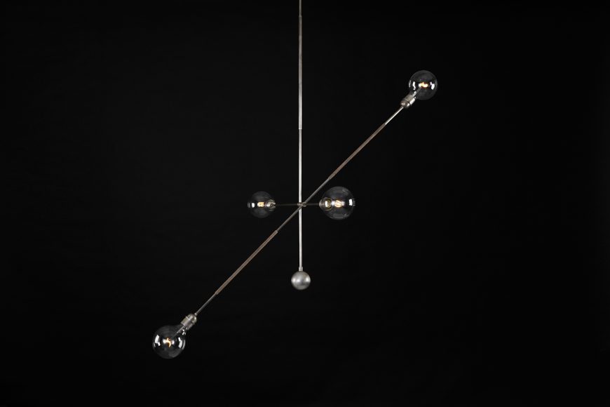 INSPIRED BY THE SILHOUETTE OF FAMED FRENCH AERIALIST PHILIPPE PETIT ON HIS WIRE. THE “BALANCE BAR” IS WRAPPED IN LEATHER OR SUEDE AND CAN BE TILTED ALONG ITS AXIS.