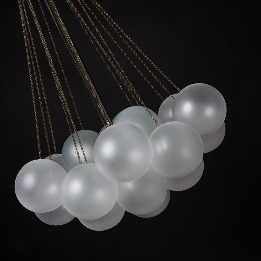 GLASS ORBS ARE FROSTED BY HAND TO CREATE AN IRREGULAR TEXTURE REMINISCENT OF 19TH CENTURY GLASS FROSTING TECHNIQUES. THREE CENTRAL LIGHT SOURCES EMIT A SOFT GLOW THAT IS REFRACTED THROUGH THE SURROUNDING CLUSTER OF ORBS.