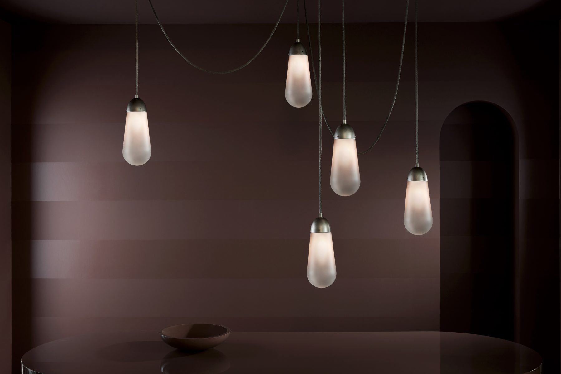 REMINISCENT OF FORMS FOUND IN JEWELRY, ETCHED GLASS TEARDROPS HANG FROM FINELY WOVEN BRASS MESH. TAUT LINES AND GRACEFUL SWAGS ARE WEIGHTED BY ELONGATED ORBS, ADDRESSING AN INTERSECTION OF GEOMETRY AND GRAVITY. CUSTOM INSTALLATIONS ARE DESIGNED BASED ON DESIRED DIMENSIONS AND NUMBER OF PENDANTS. SCONCES AND INSTALLATIONS ARE AVAILABLE WITH LARGE PENDANT OR SMALL PENDANT.