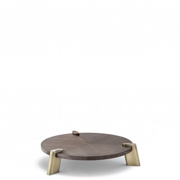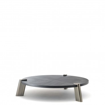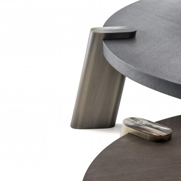 With their contemporary feel and bold design the Pompei coffee tables will set the tone of your living room. Finely handcrafted from tobacco or black oak veneer, their round top is an ideal spot for books, magazines, or fresh flowers. Supported by three slanted feet available in satin or burnished brass-plated stainless steel finish, these tables are accented with gorgeous details in matte horn that offer an elegant grain and a tactile design.