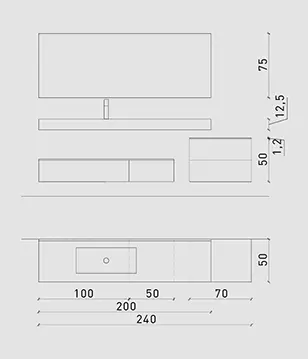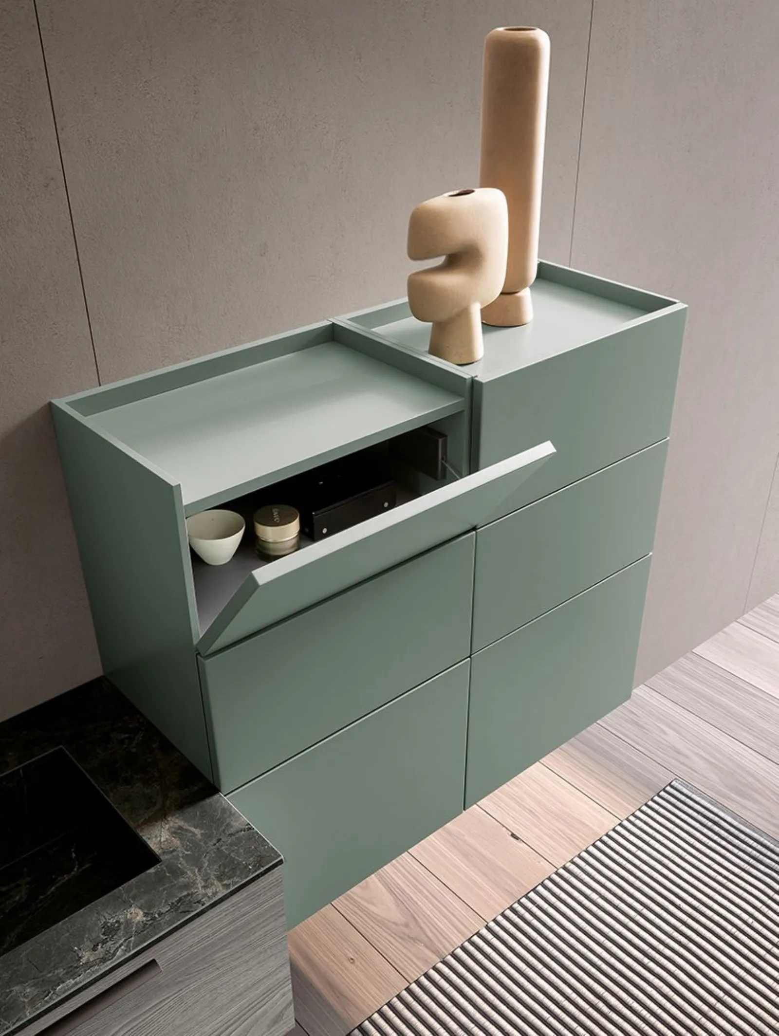 BASE PORTA LAVABO CON FRONTALE A "L" IN MEZZAFIAMMA GRIGIO CON MAN. M22 TITANIO E VANO LATERALE A GIORNO LACCATO GIADA OPACO COME LA COMPOSIZONE DI PENSILI AFFIANCATA - TOP IN GRES AMAZONICO SLATE CON VASCA GZZ5 - SPECCHIO RAGGIO CON LAMPADE TUBE NERE.