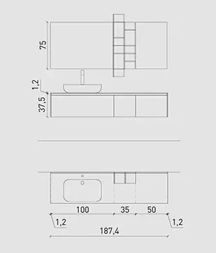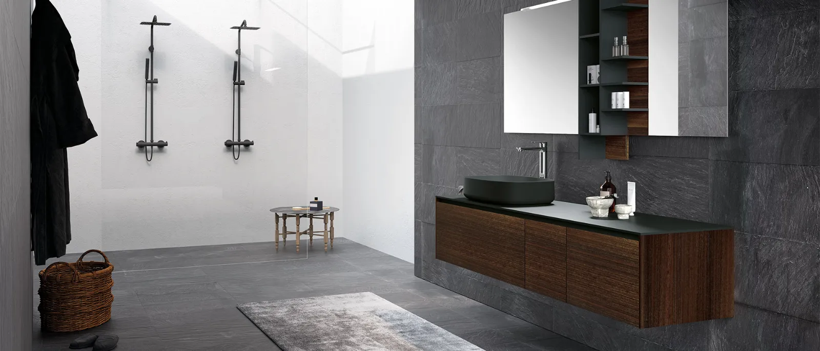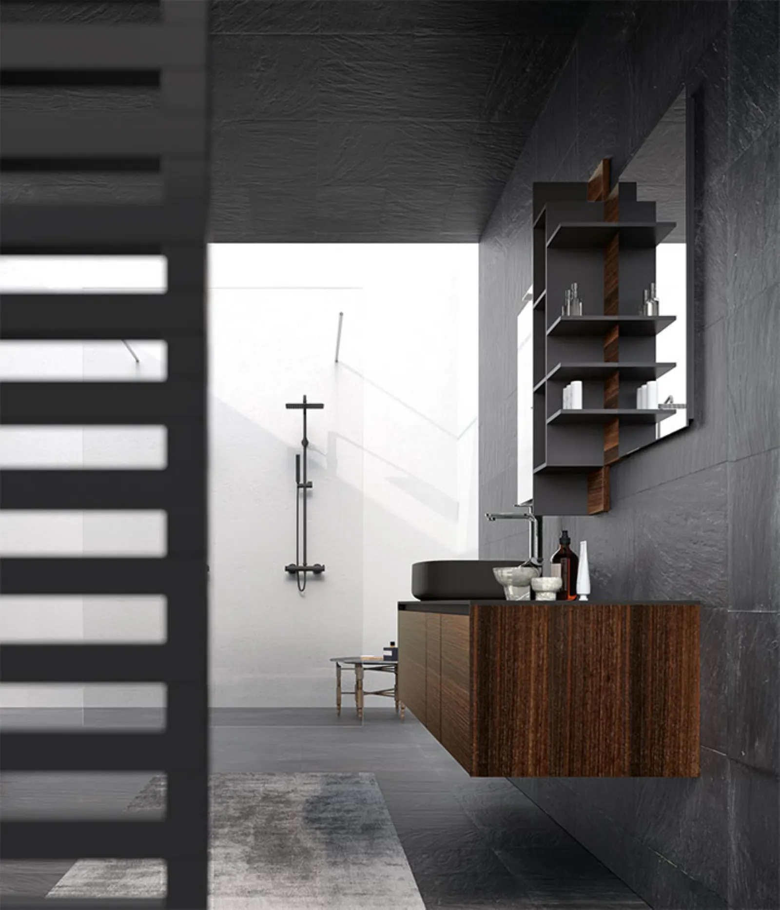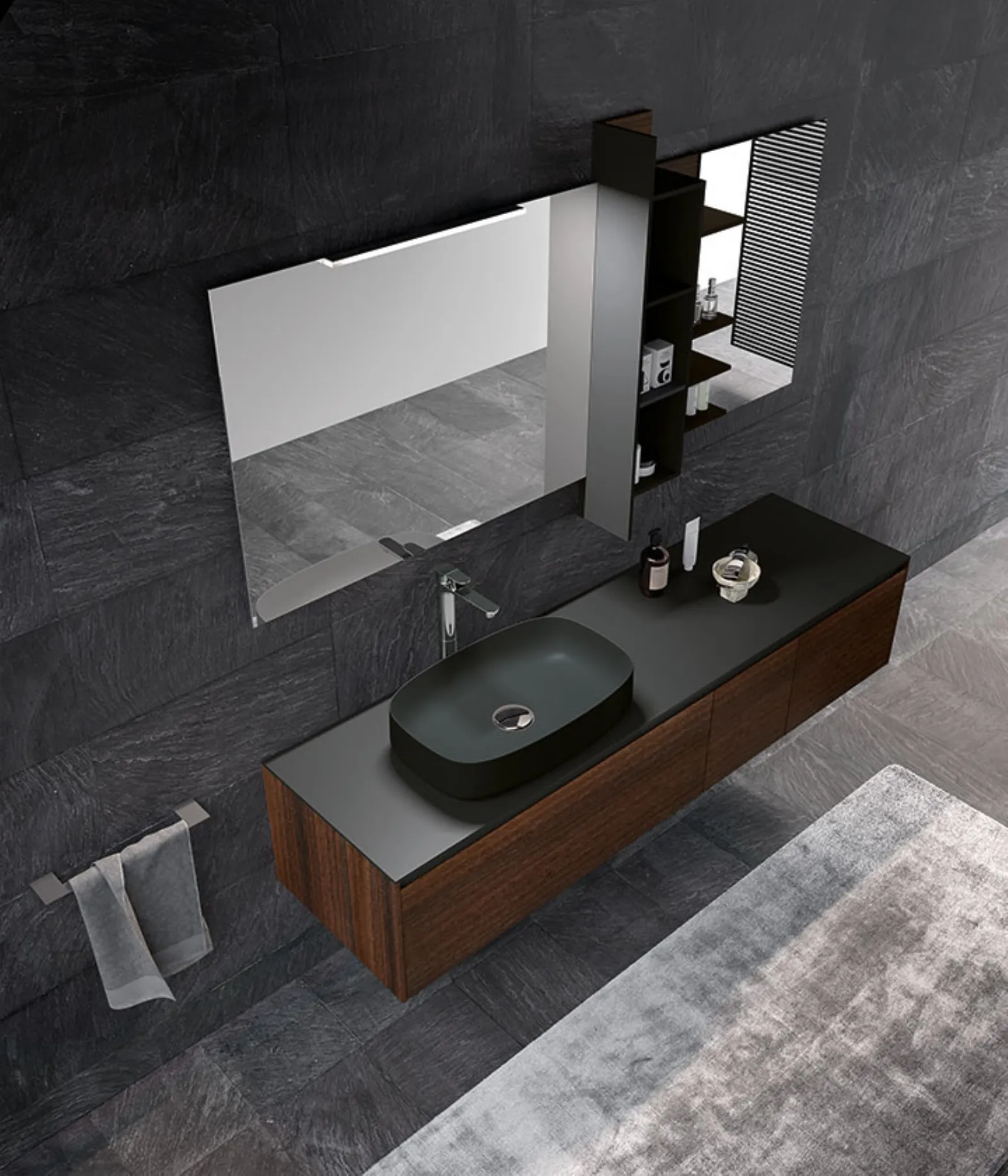Impiallacciato Eucalipto affumicato con particolari laccati Nero opaco. Top gres Ossido Nero con lavabo Elite nero opaco. Specchio profilo alluminio con lampada Clio Slim.