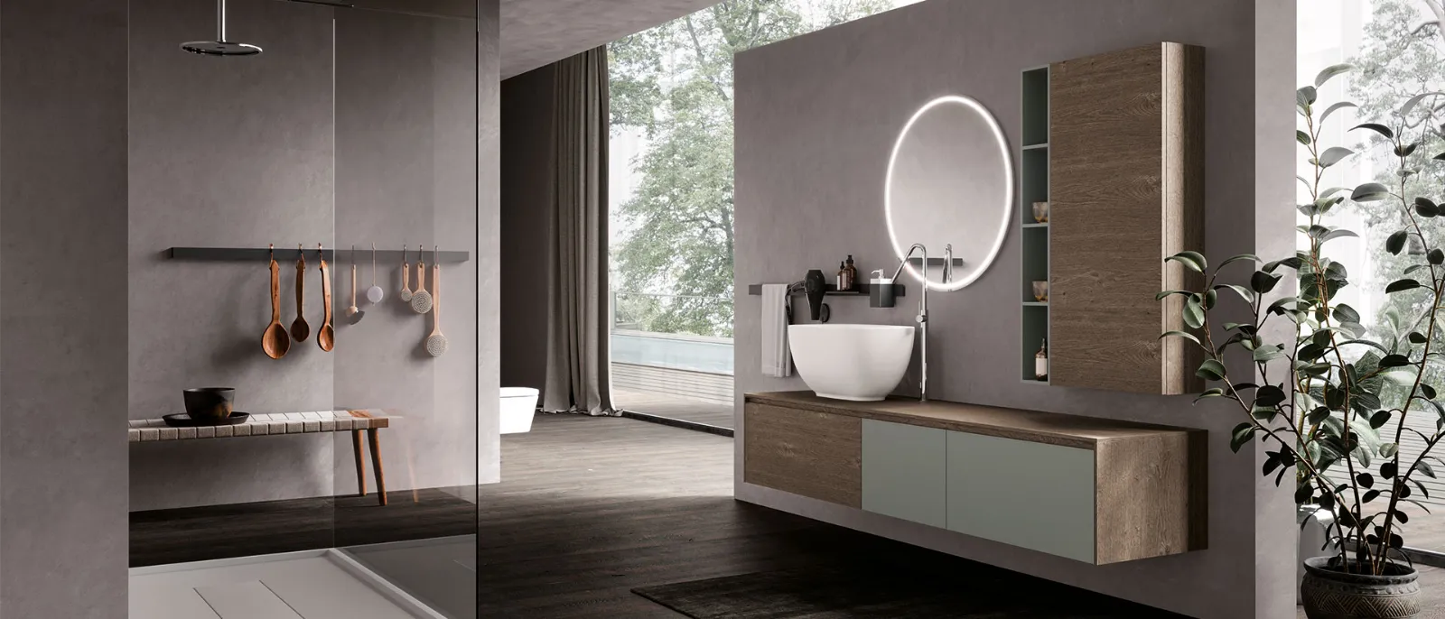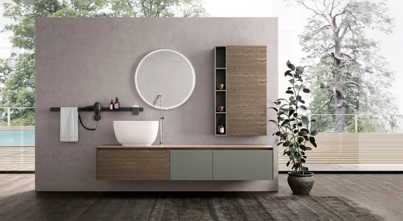 Impiallacciato Nordico Caffe? e laccato Giada opaco. Top Nordico Caffe? con lavabo Lady in Tecnoril, specchio Moon.