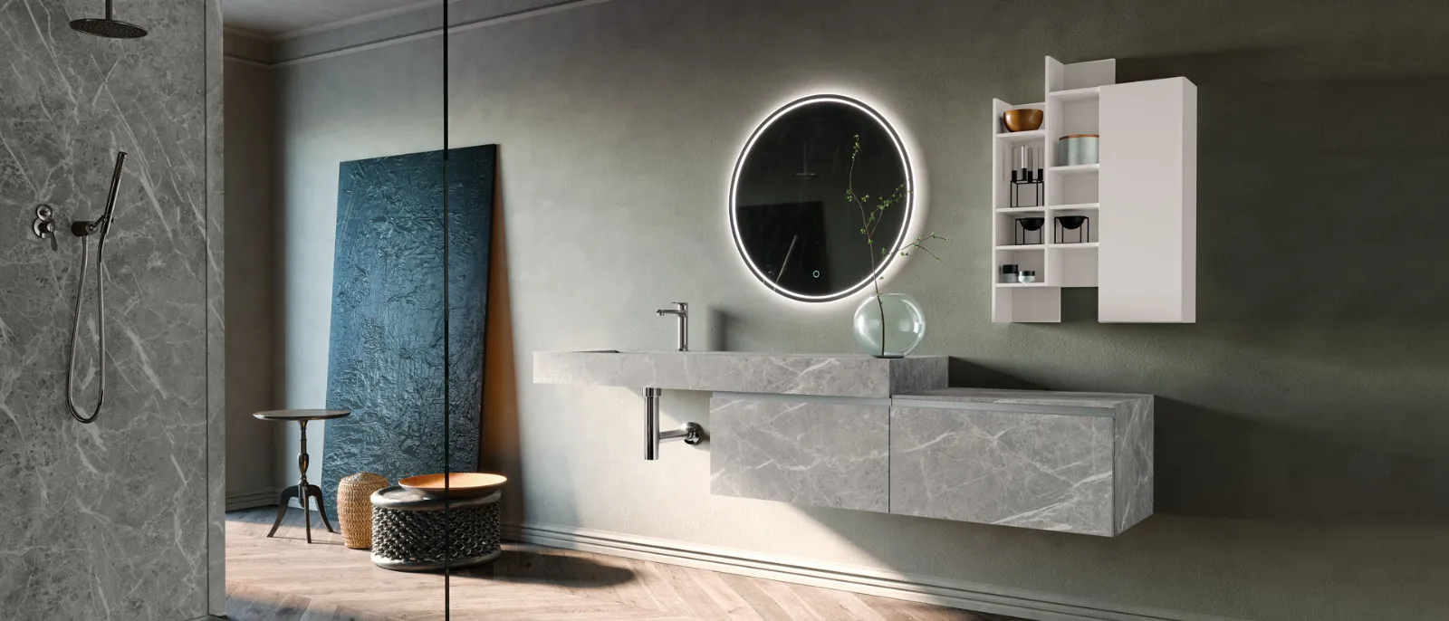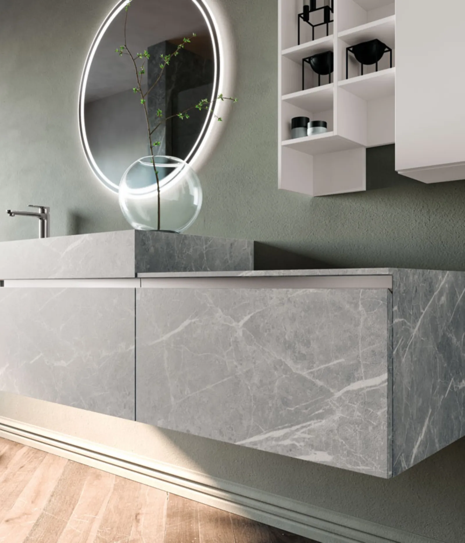 Hpl Antique, maniglia alluminio satinato, pensile ed elementi a giorno “Square” laccati Bianco Opaco. Top hpl Antique sp. 10 cm con vasca integrata “HF”, specchio Moon.