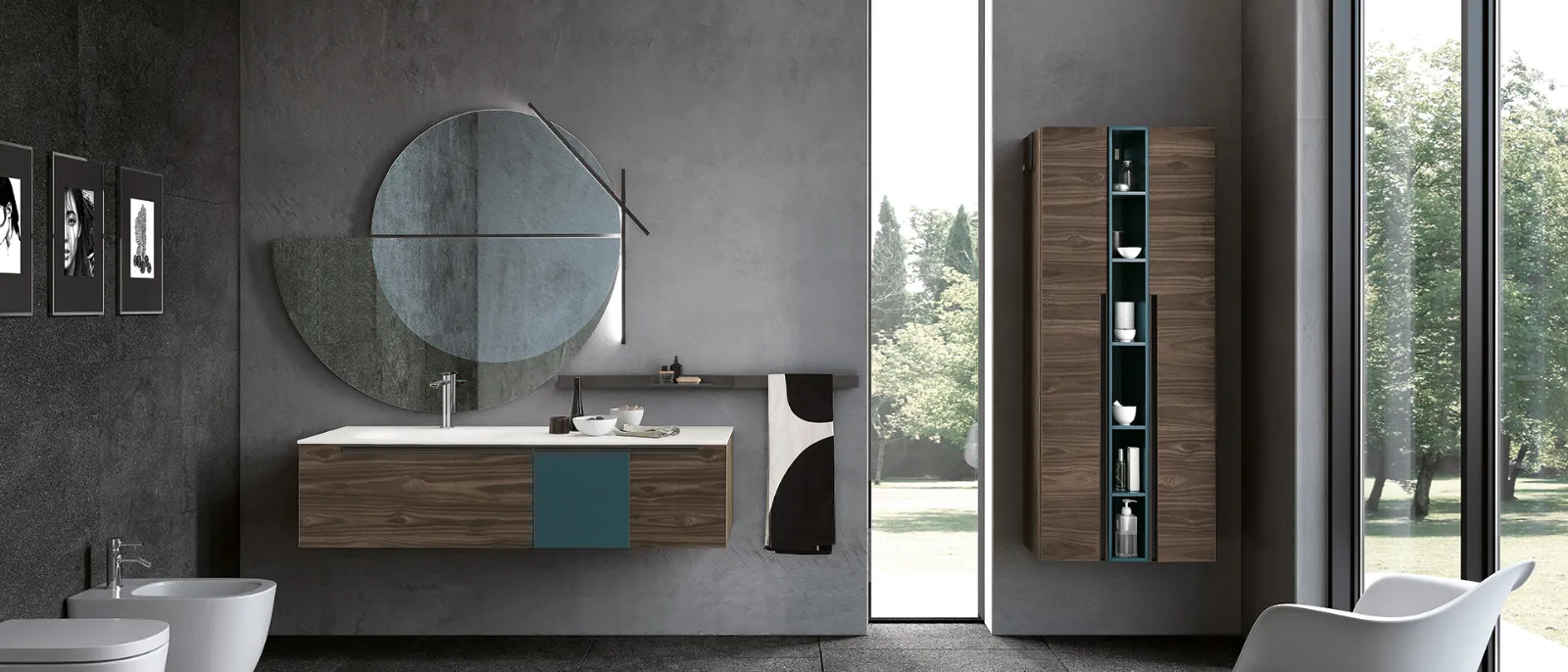 Bimelaminico minato e laccato petrolio opaco con maniglie titanio. Top corian con vasca integrata cn. Specchi Jupiter e Sputnik con lampada Compasso.