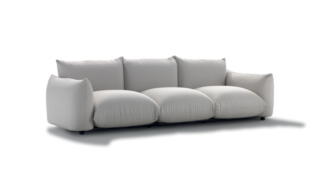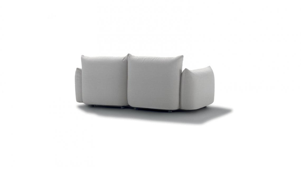 Linear sofa with soft, rounded shapes, which can be used to furnish both residential and hospitality verandas.