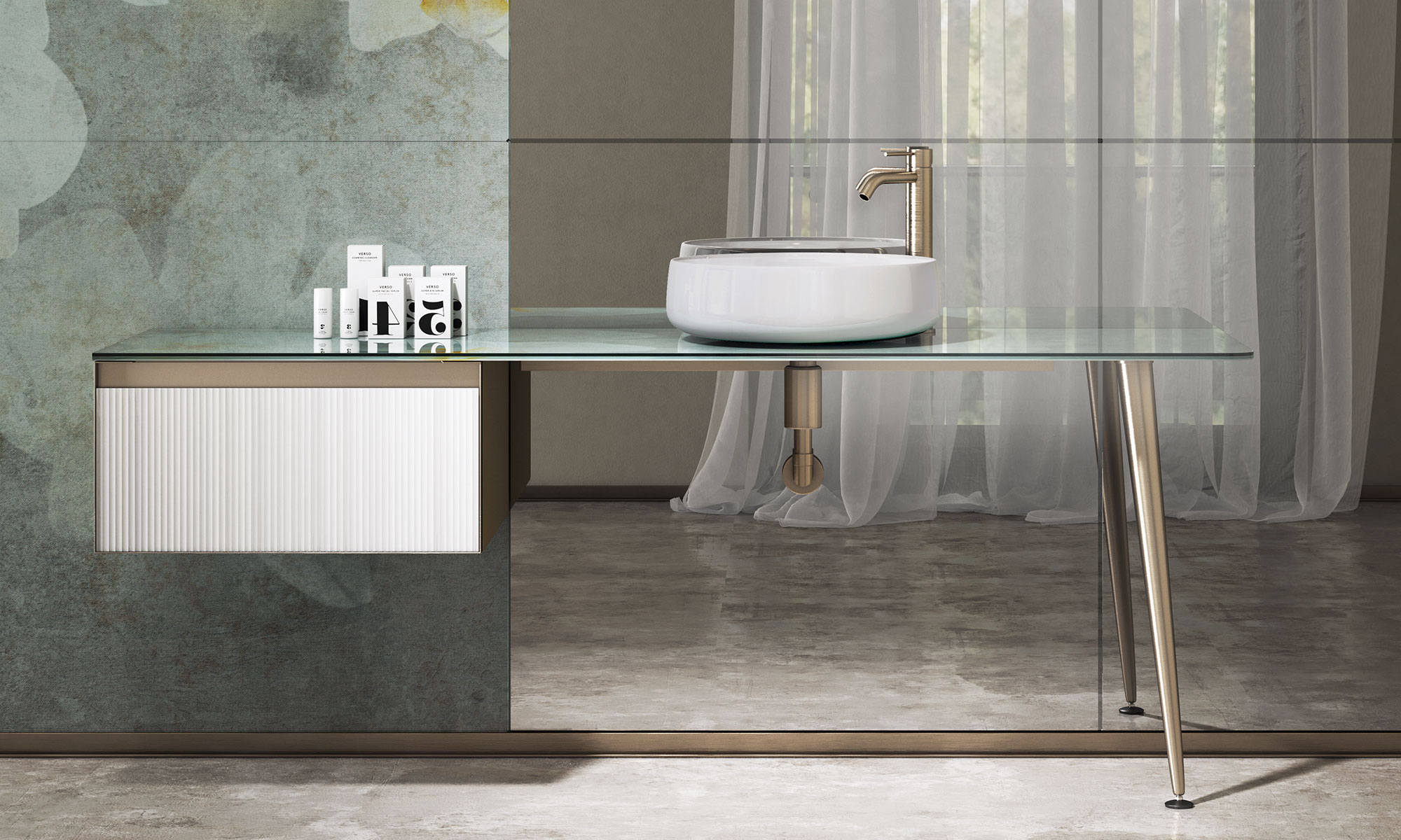 Abbiamo cavalcato l ’attuale orientamento di perseguire forme e linee tendenzialmente Vintage. Ne deriva una composizione lineare e pulita, ma allo stesso tempo funzionale e significativa nella sua semplicità. La combinazione di materiali come vetro e metallo, apparentemente così essenziali, attribuisce carattere ed espressività alla collezione stessa.