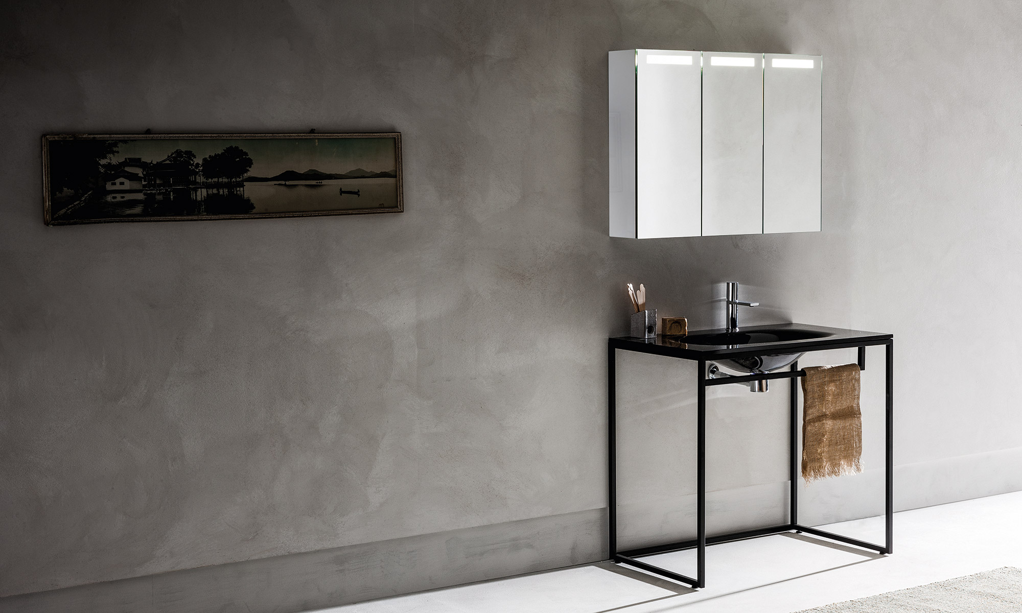 Struttura lineare e forme pulite. La collezione in acciaio verniciato nero opaco si combina perfettamente con la fusione del basintop di serie proposto in Opalite bianca o nera. Modularità e accessori abbinati, completano questa linea dal gusto contemporaneo.