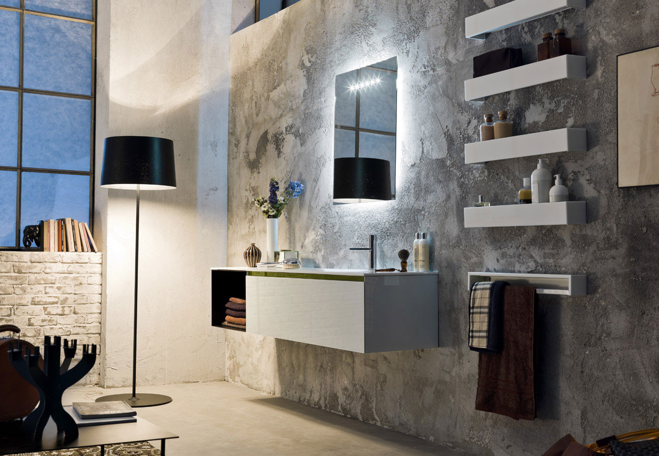 Per questa collezione è stato pensato un lavabo integrato dalla fusione particolare che permette di sfruttare al meglio tutta la profondità del mobile e di poter usufruire di miscelatori sia da appoggio che a muro.
