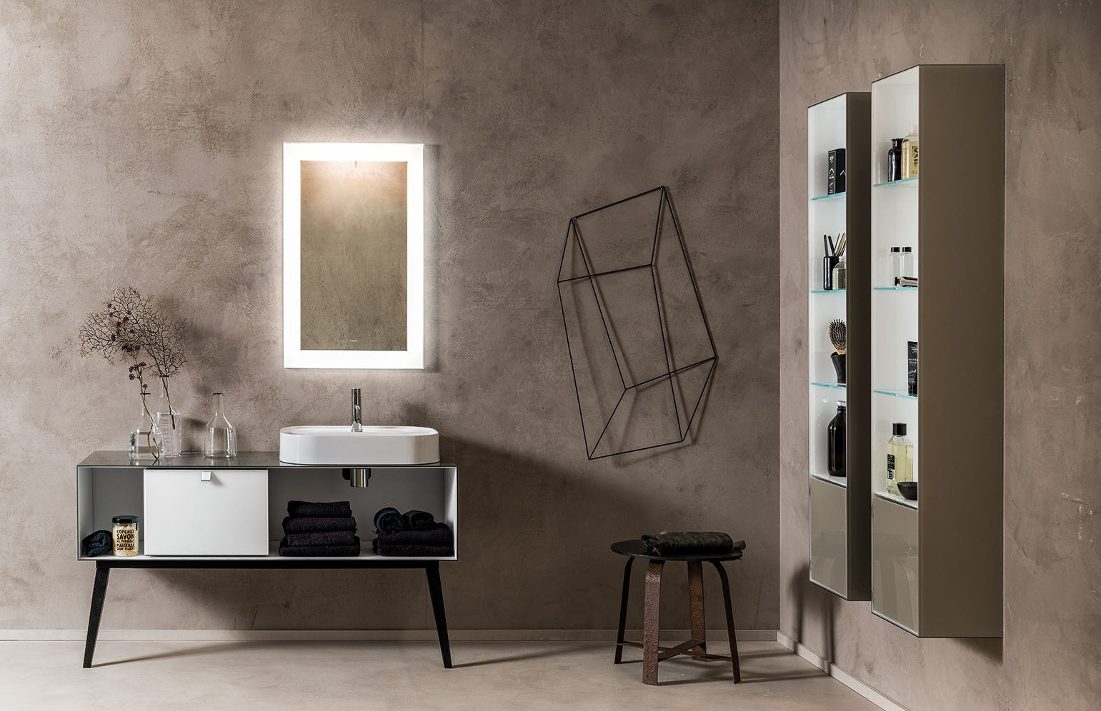 La razionalità del disegno del monoblocco è sdrammatizzata sia dalla componibilità interna data dai cassetti e dai vani a giorno, posizionabili liberamente all’interno dello spazio, sia dalla possibilità di abbinare colori diversi, grazie a Dualite.