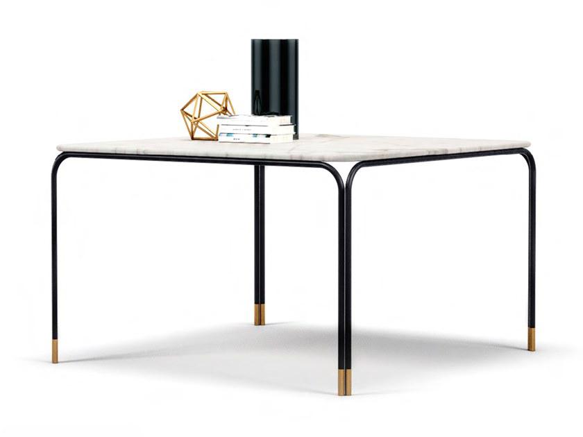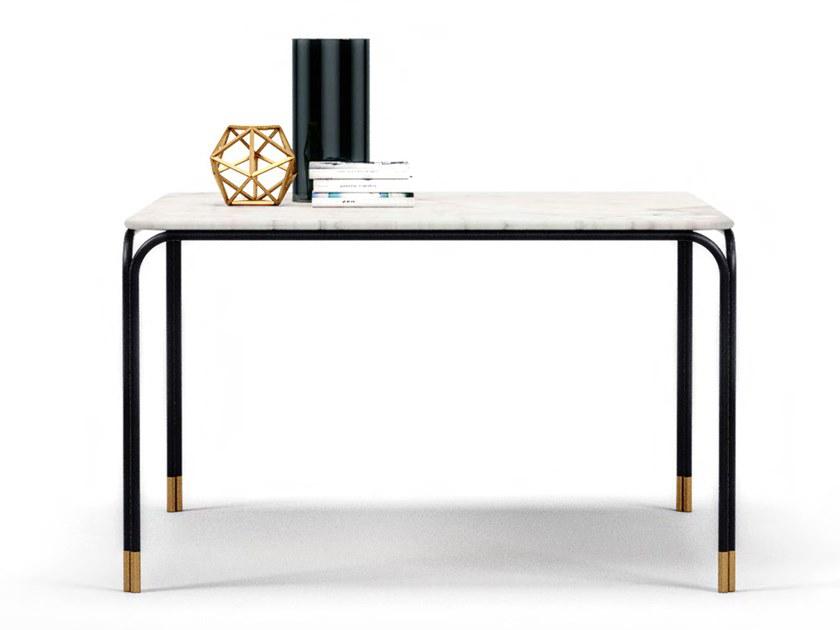 Dining table, cm 220x100x73h Top in Grigio carnico Marble, metal structure in matt black, feet in light gold finish
