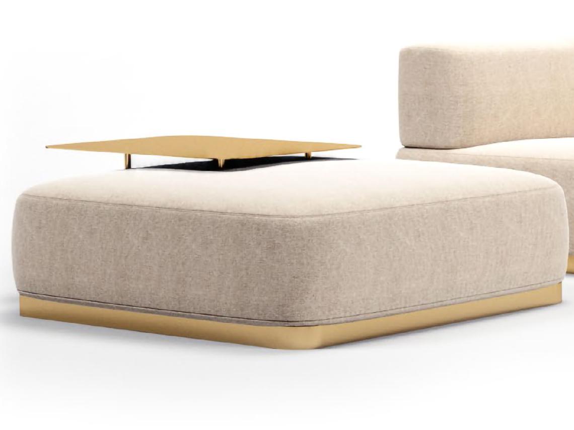 Pouf with tray, cm 116x100x46h Upholstery in Nabuk col. Sand, metal base & tray in light gold sateen