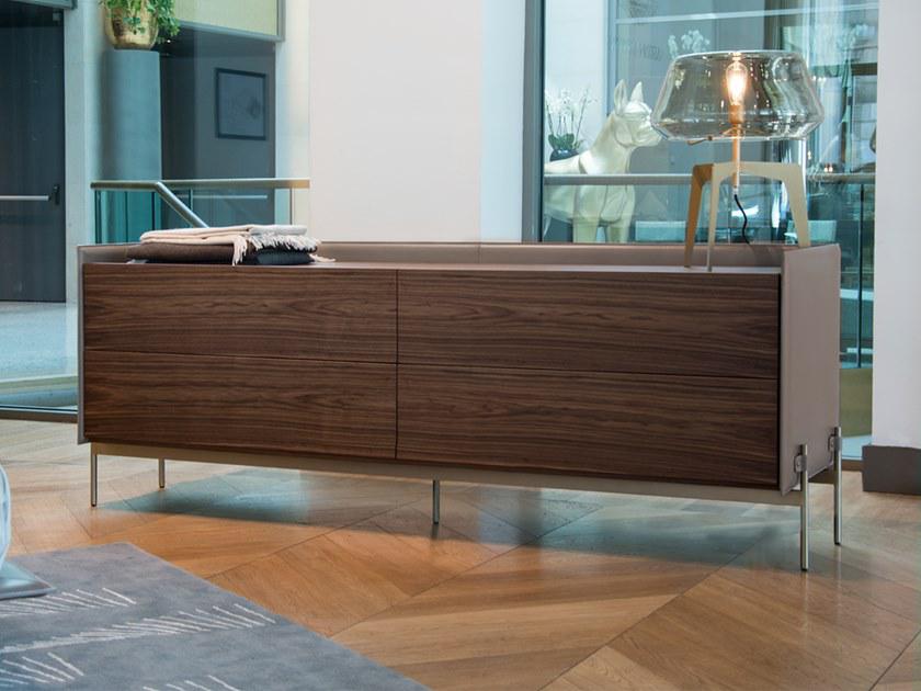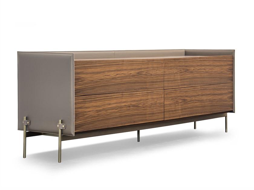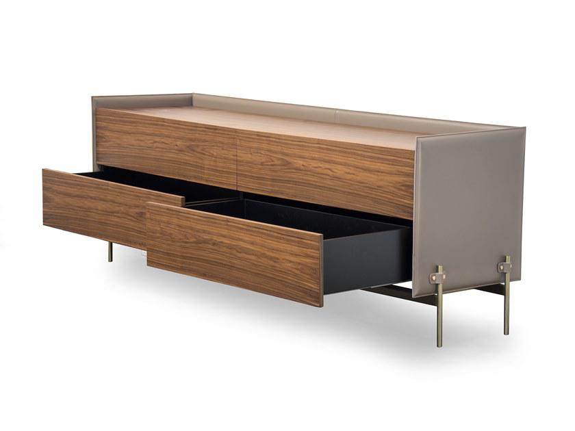 TV Cabinet, cm 230x60x60h Top and fronts in veneer Ash Stained  Mink, structure in Cuoio col. Taupe,  flaps in Cuoio col. Taupe, metal  structure in light gold