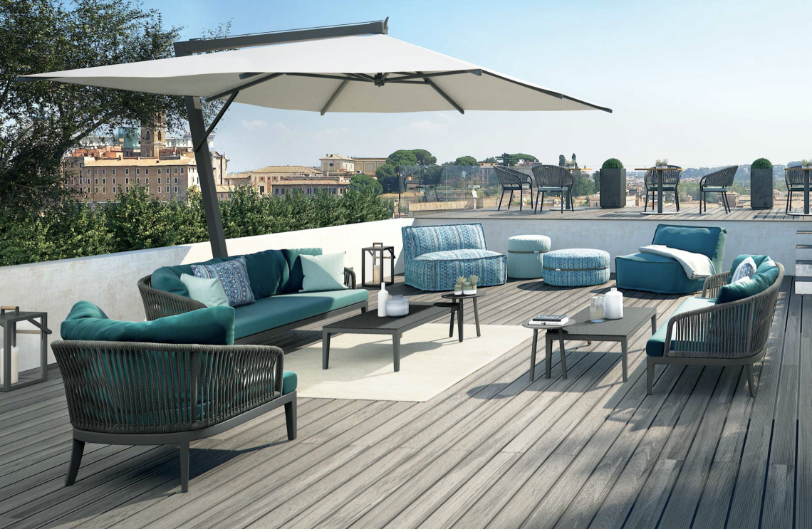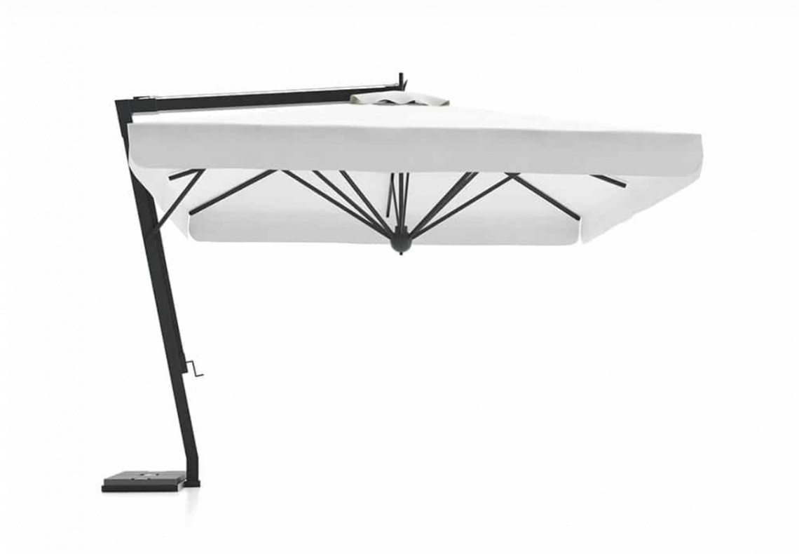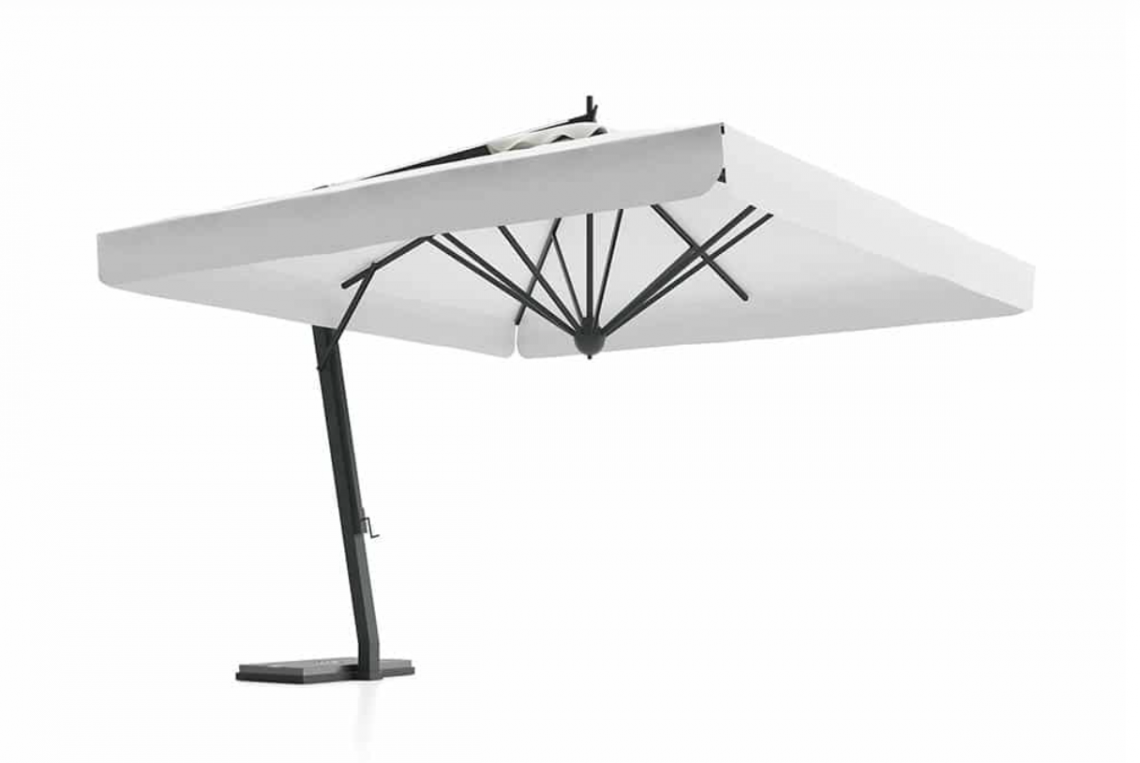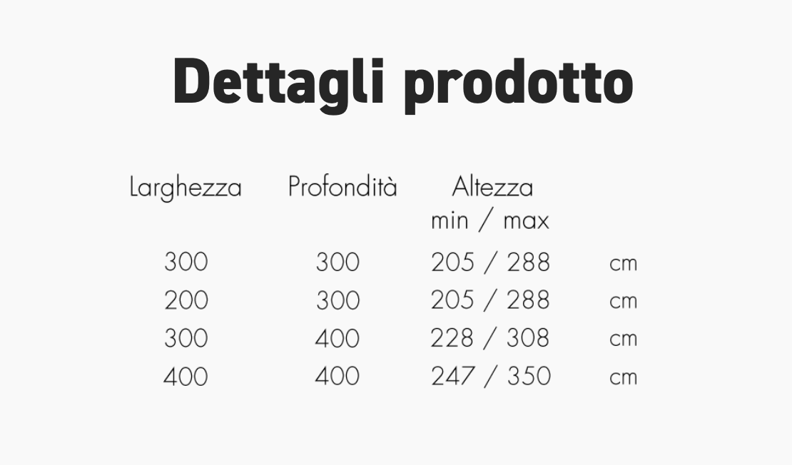 Telaio in alluminio verniciato grigio o bianco. Tessuto acrilico gr. 320 in colore bianco. Completo di soffietto antivento, apertura a manovella. Girevole a 360°.