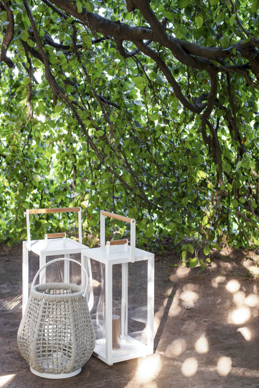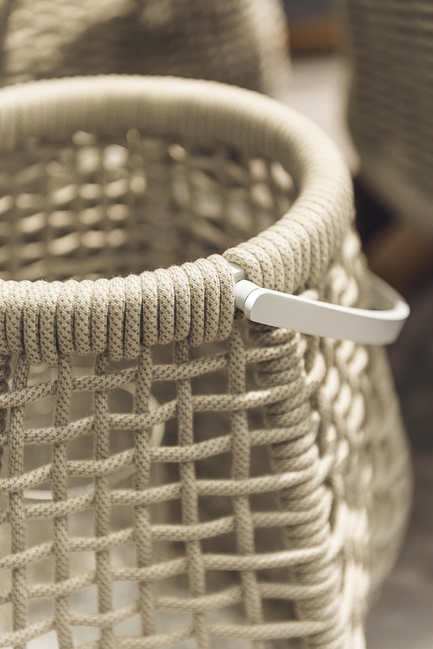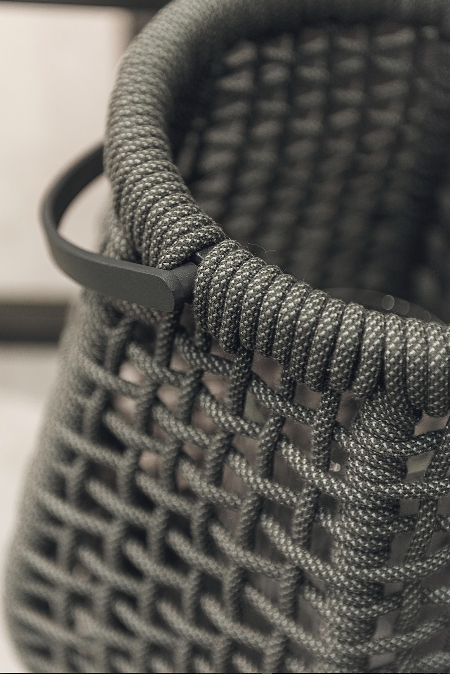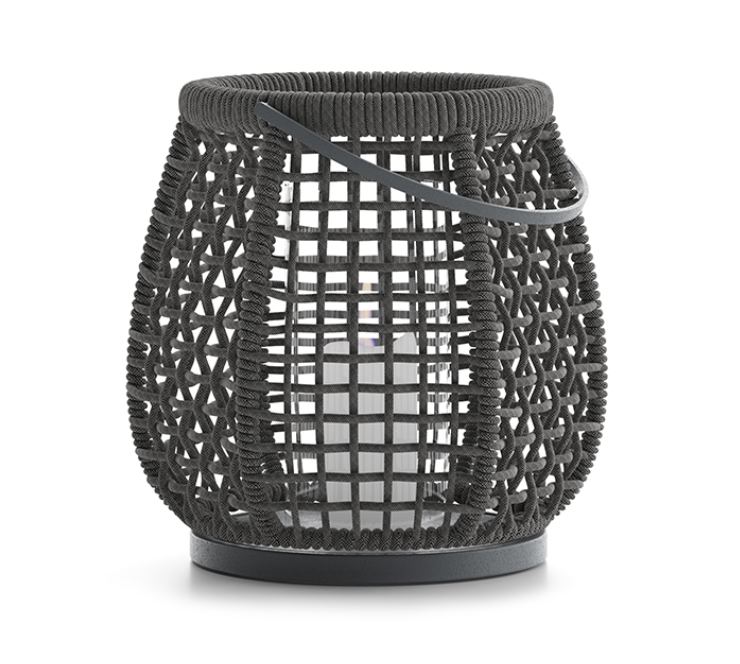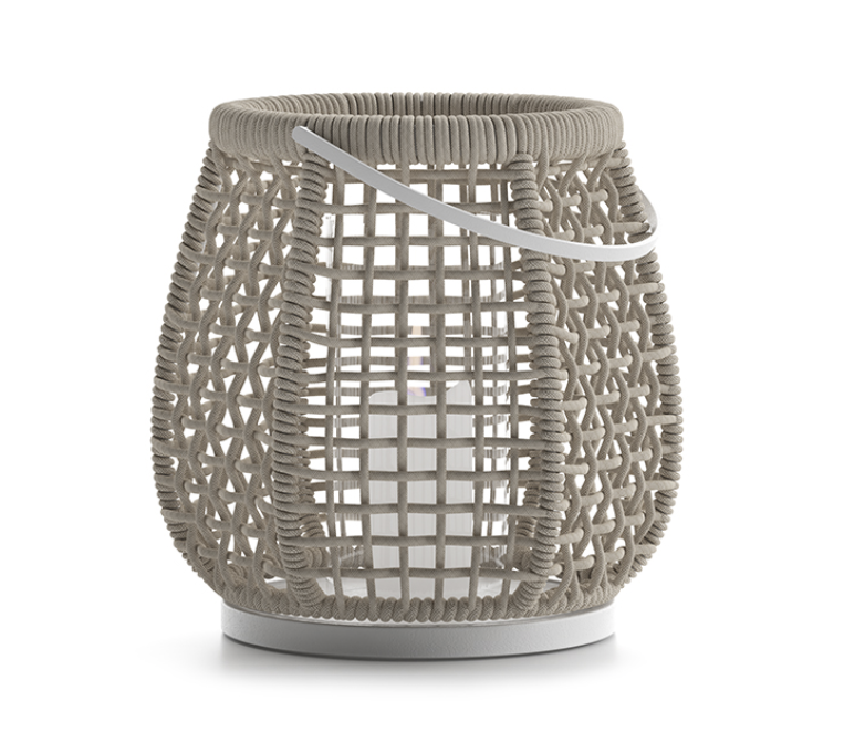 Grazie alle forme organiche, la luce viene filtrata attraverso corde tramate fissate ad una struttura in alluminio. Adatta a rimanere all’esterno tutto l’anno.