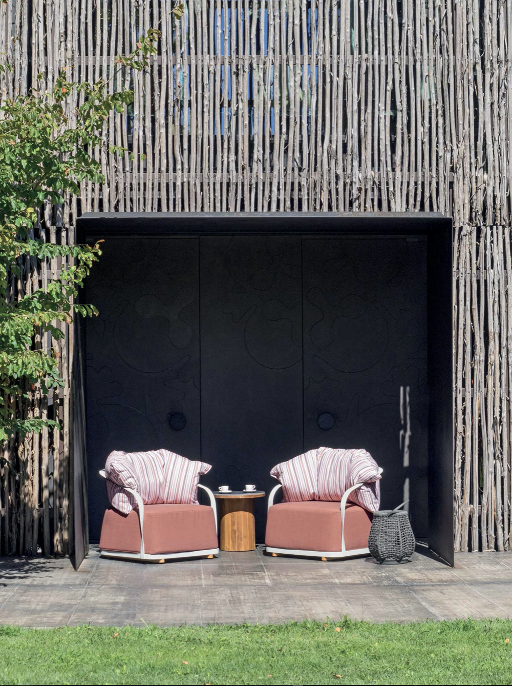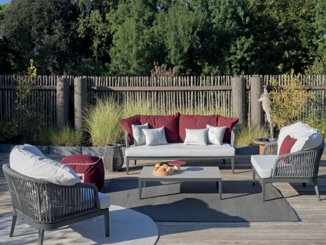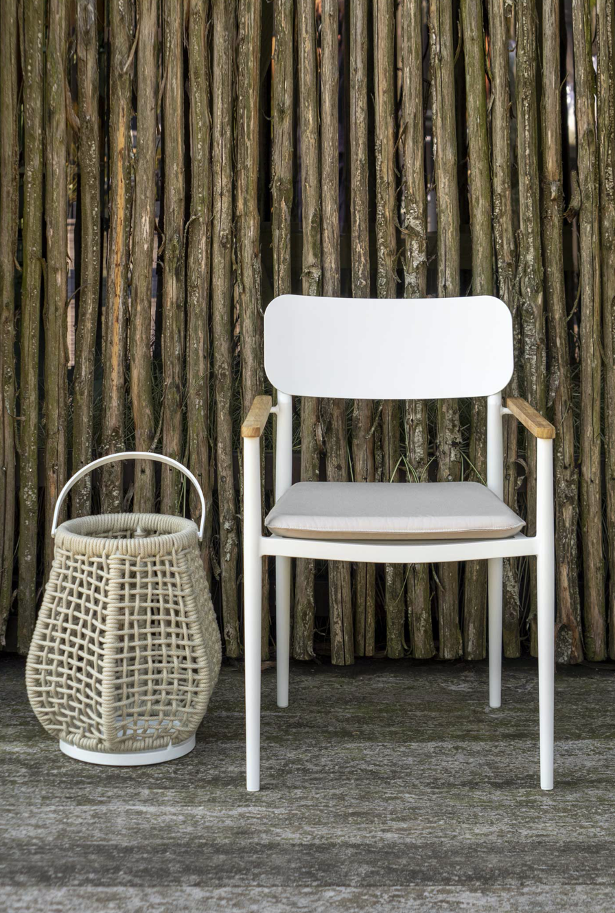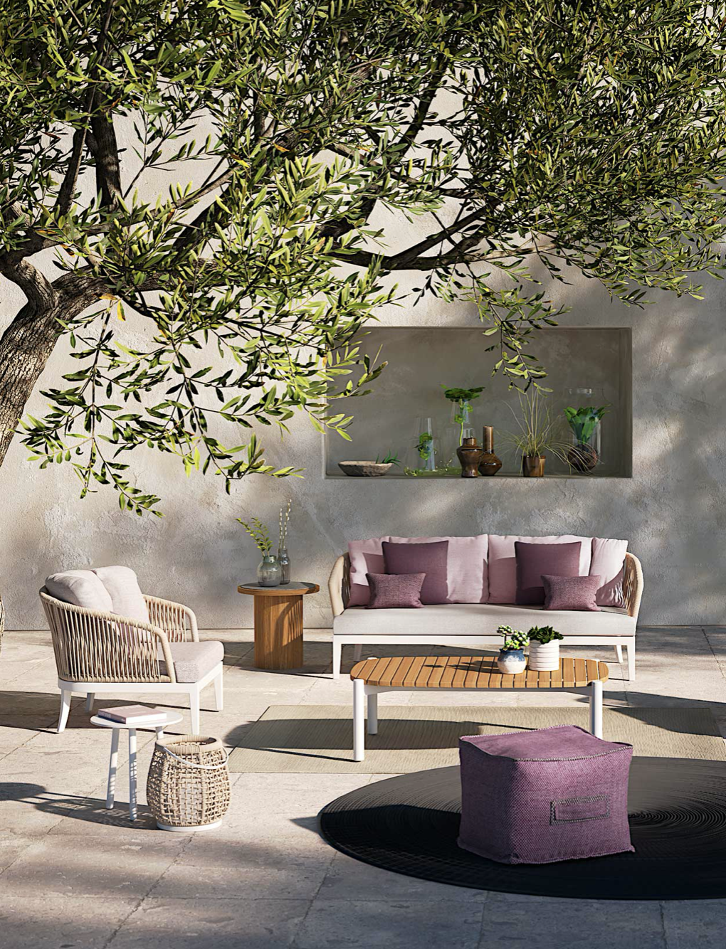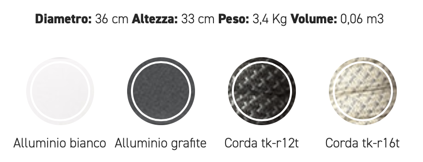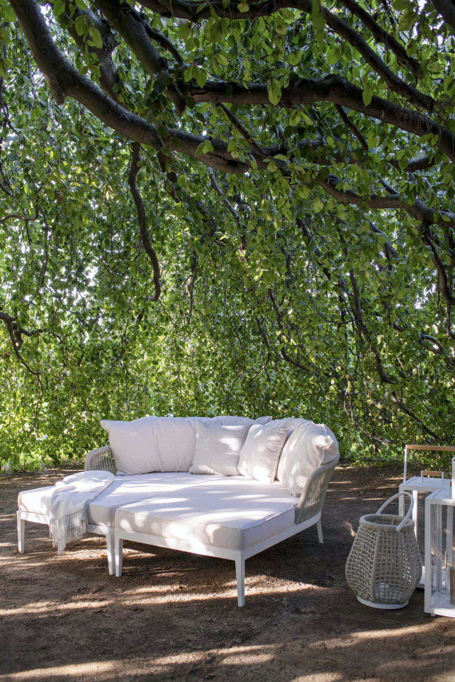 Grazie alle forme organiche, la luce viene filtrata attraverso corde tramate fissate ad una struttura in alluminio. Adatta a rimanere all’esterno tutto l’anno.