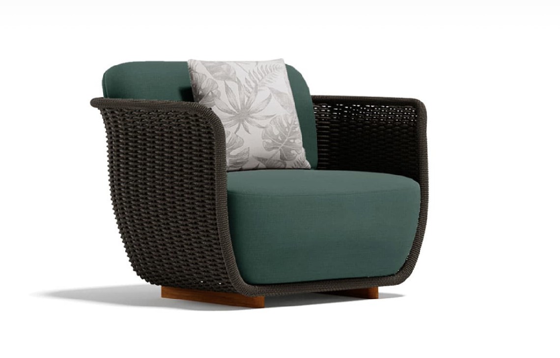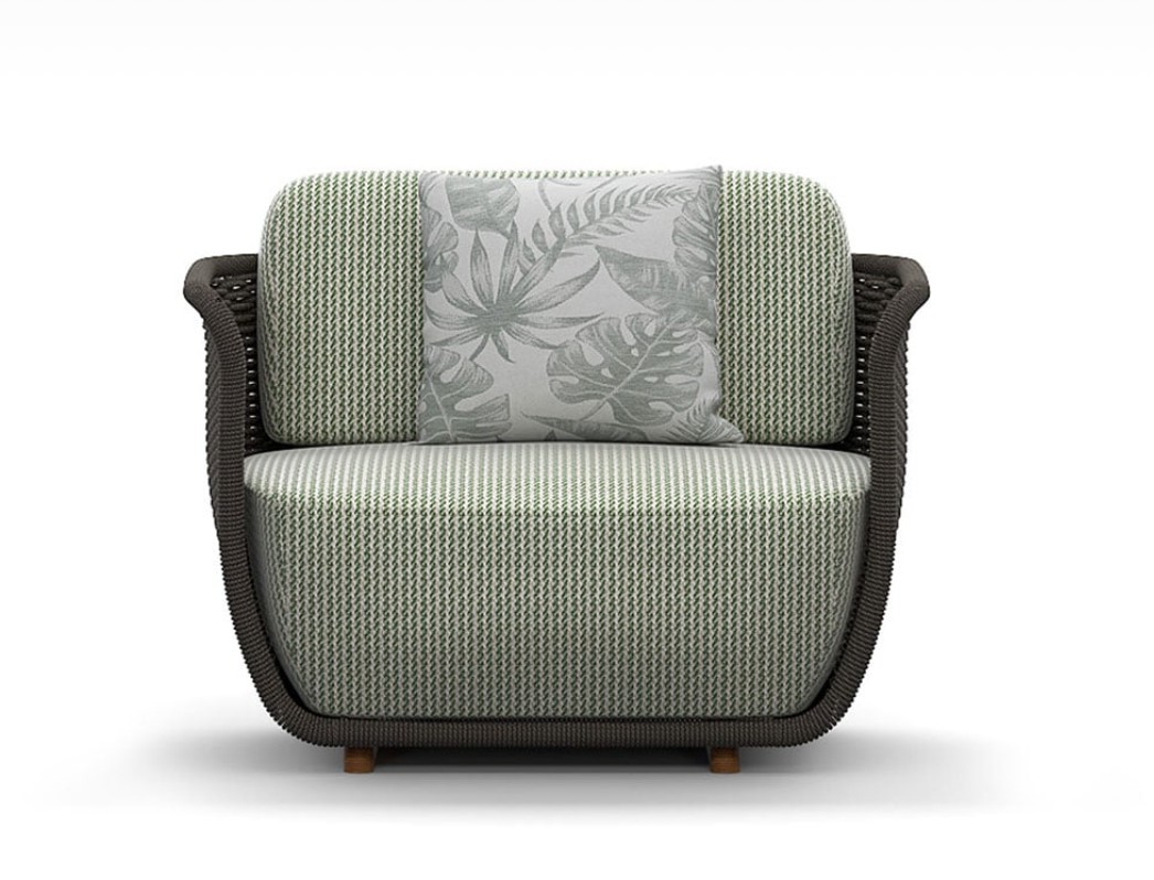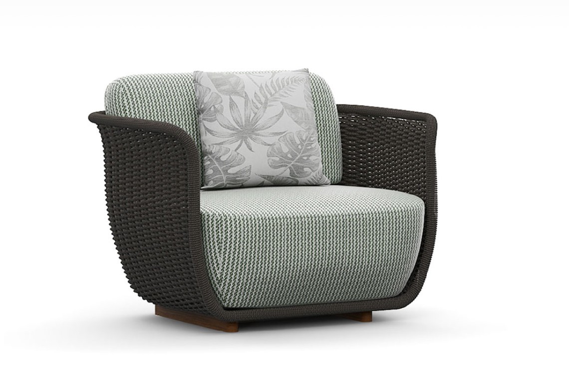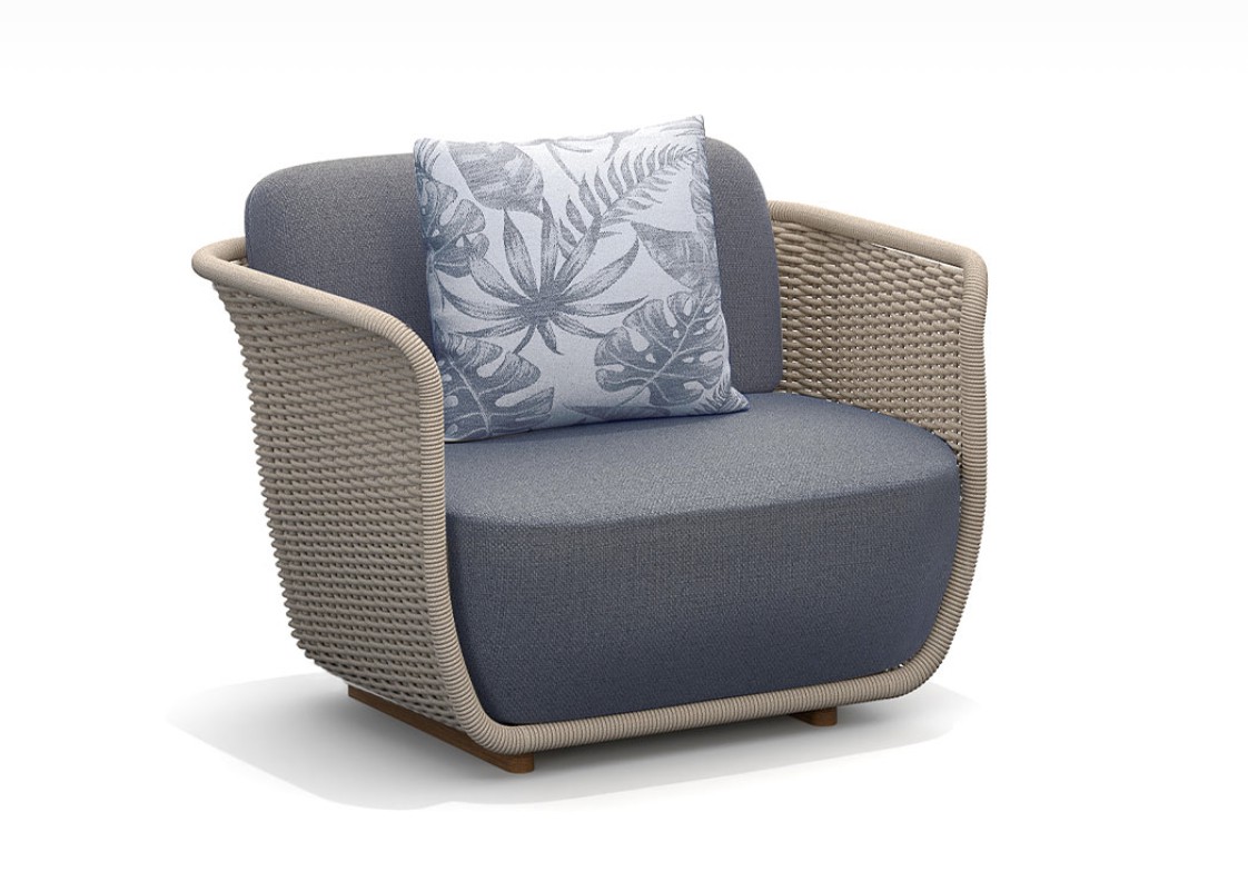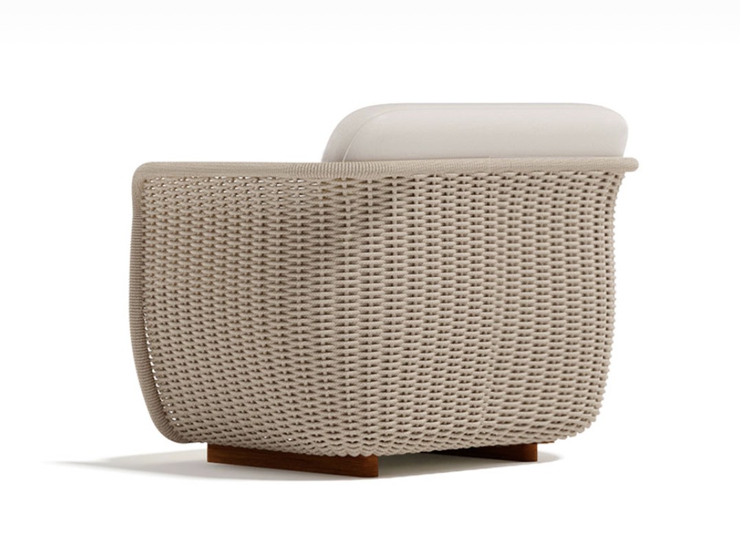 Poltrona con struttura in teak abbinata a corde intrecciate a mano in fibra acrilica di Teflon, a sezione tonda, resistenti all’acqua e di facile pulizia. Il materiale presenta un appeal morbido e raffinato simile ad intrecci tessili. Si caratterizza per la sua resistenza ai raggi UV e per la velocità di asciugatura.
