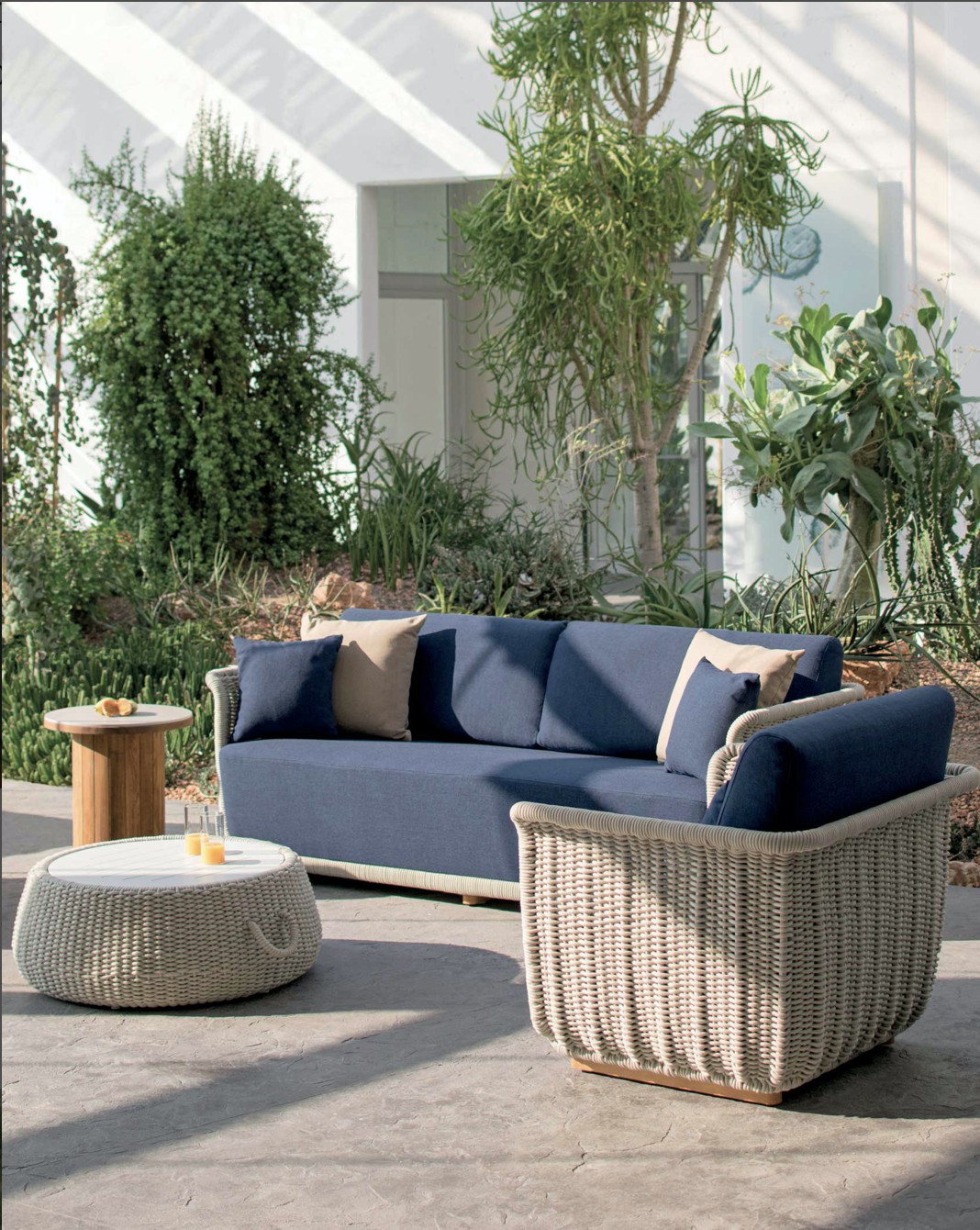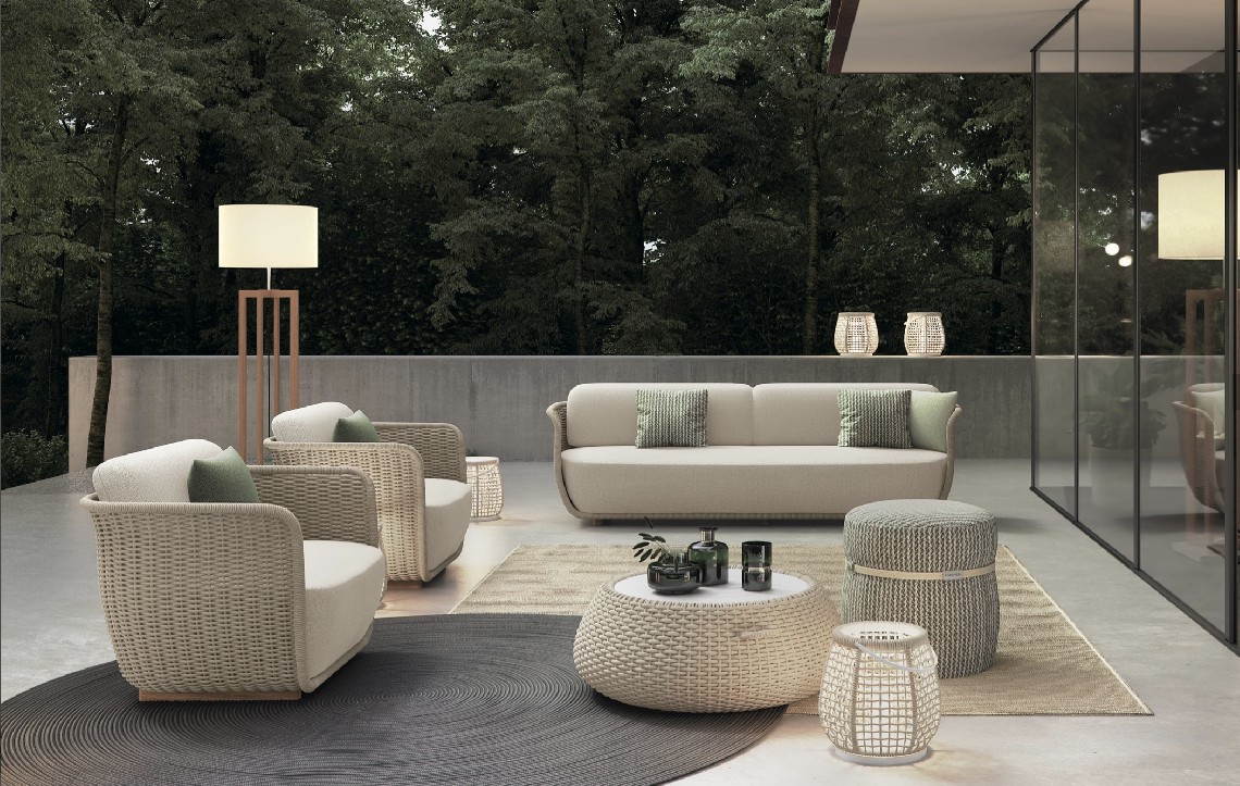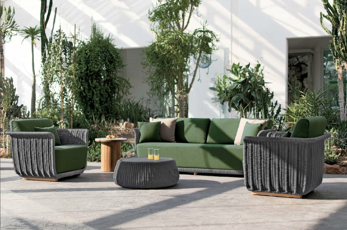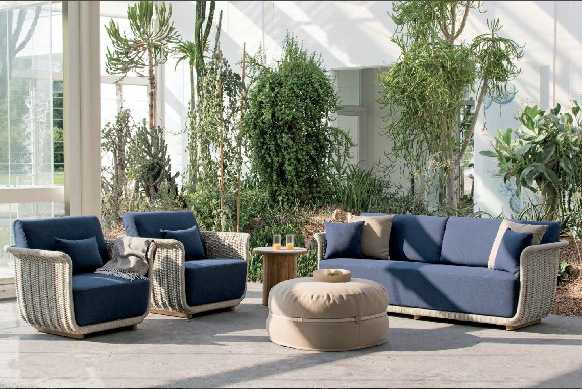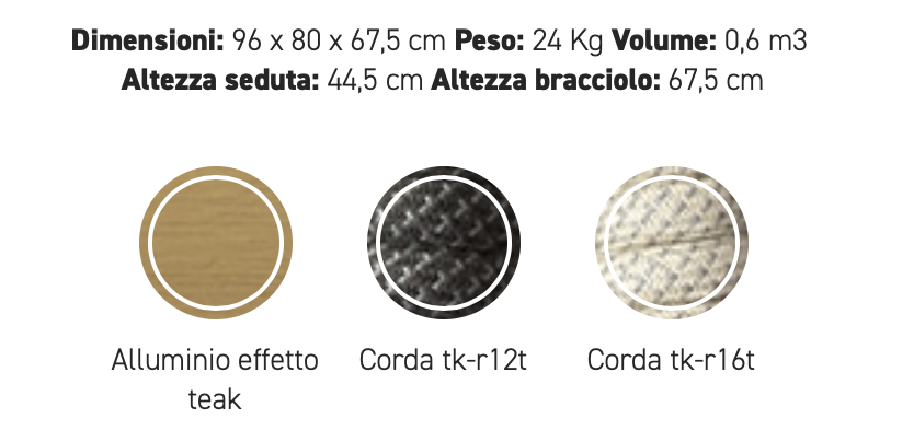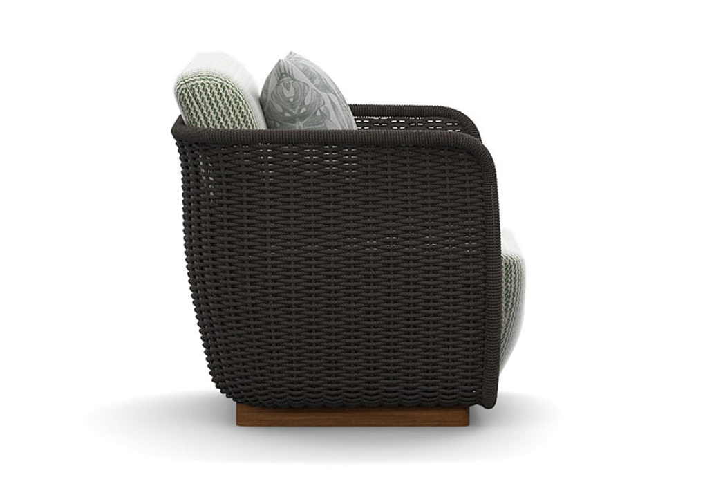 Poltrona con struttura in teak abbinata a corde intrecciate a mano in fibra acrilica di Teflon, a sezione tonda, resistenti all’acqua e di facile pulizia. Il materiale presenta un appeal morbido e raffinato simile ad intrecci tessili. Si caratterizza per la sua resistenza ai raggi UV e per la velocità di asciugatura.