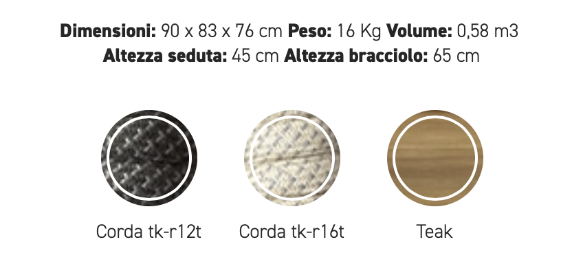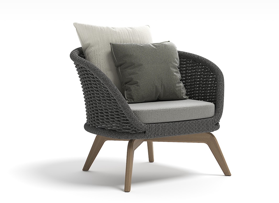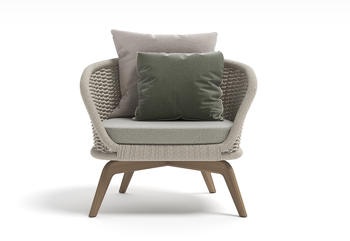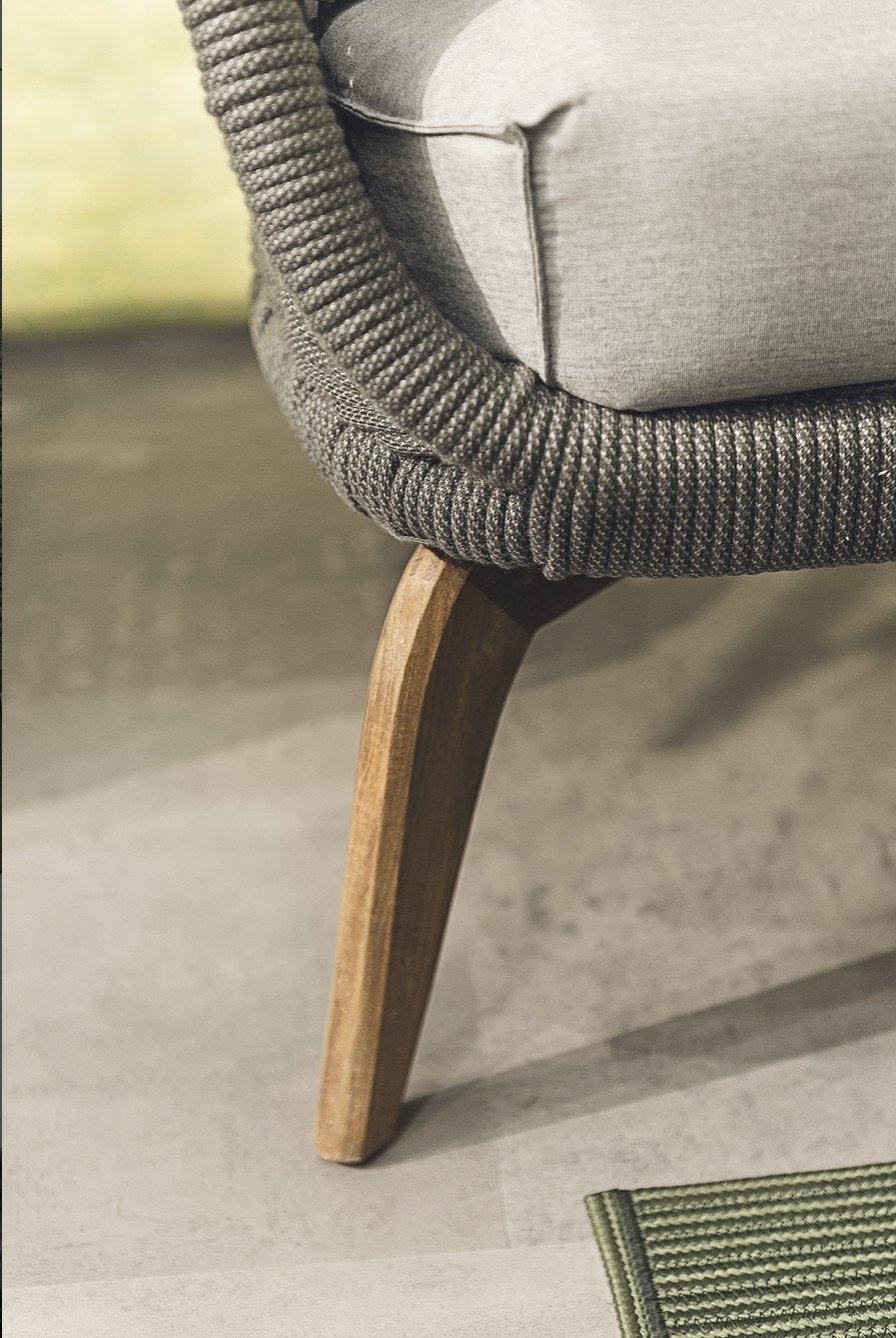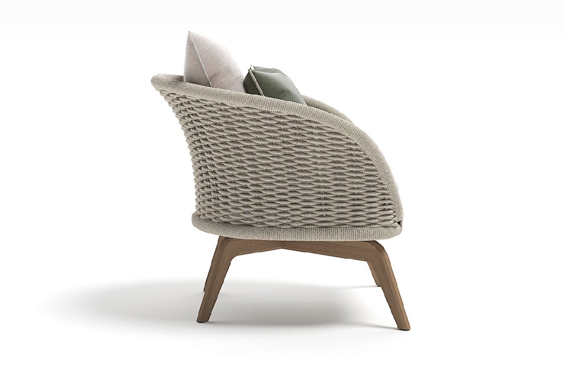 Poltrona con base in teak abbinata a corde intrecciate a mano in fibra acrilica di Teflon, a sezione tonda, resistenti all’acqua e di facile pulizia. Il materiale presenta un appeal morbido e raffinato simile ad intrecci tessili. Si caratterizza per la sua resistenza ai raggi UV e per la velocità di asciugatura.