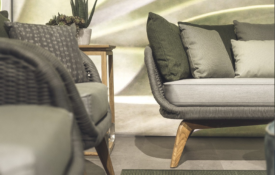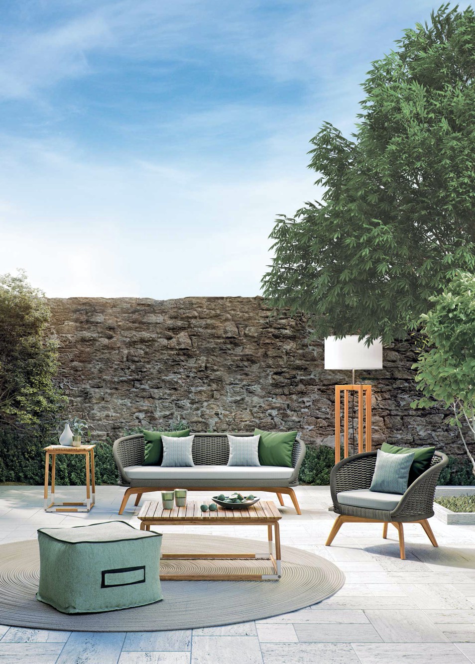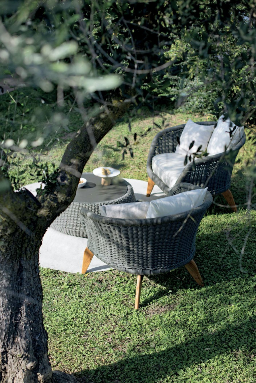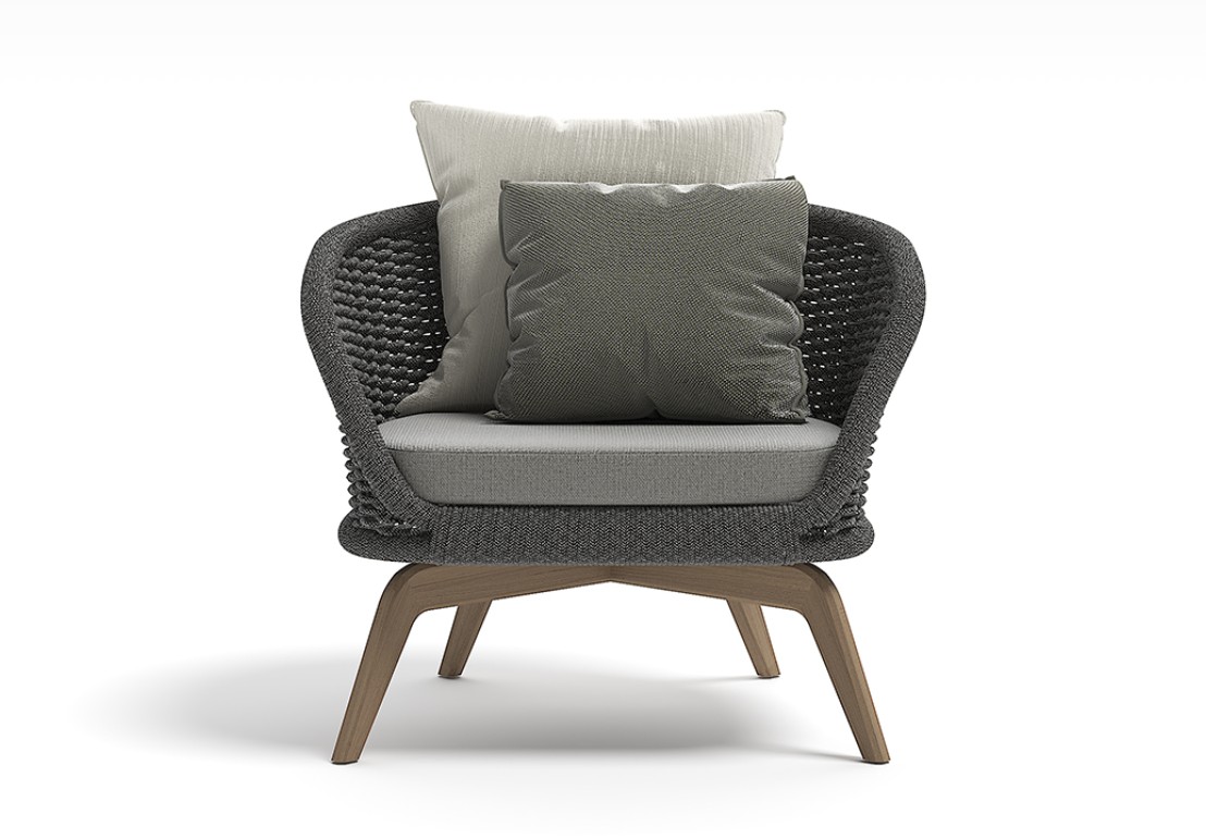Poltrona con base in teak abbinata a corde intrecciate a mano in fibra acrilica di Teflon, a sezione tonda, resistenti all’acqua e di facile pulizia. Il materiale presenta un appeal morbido e raffinato simile ad intrecci tessili. Si caratterizza per la sua resistenza ai raggi UV e per la velocità di asciugatura.