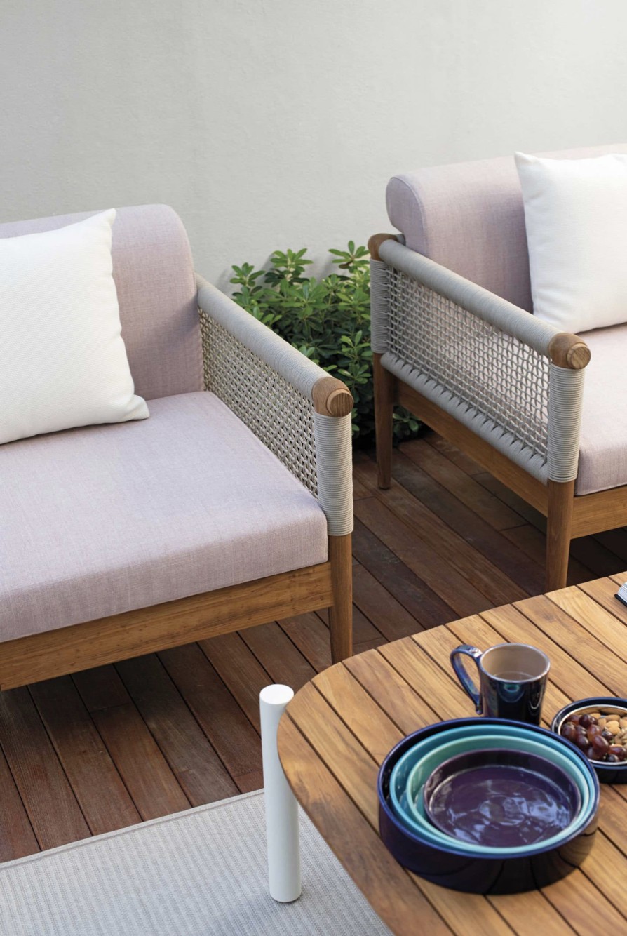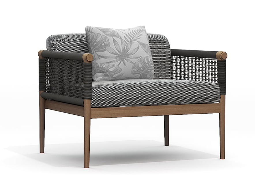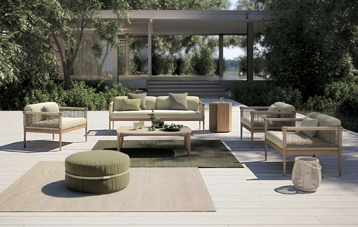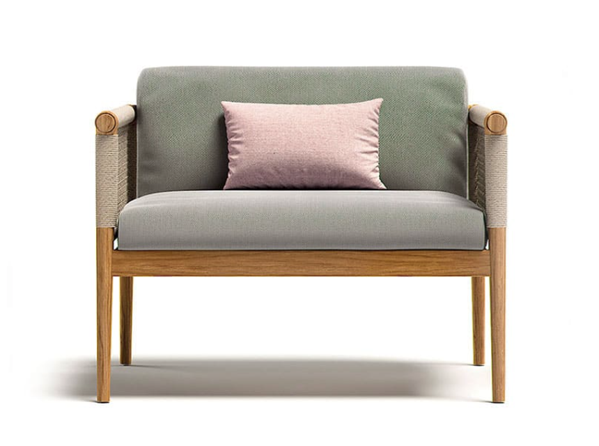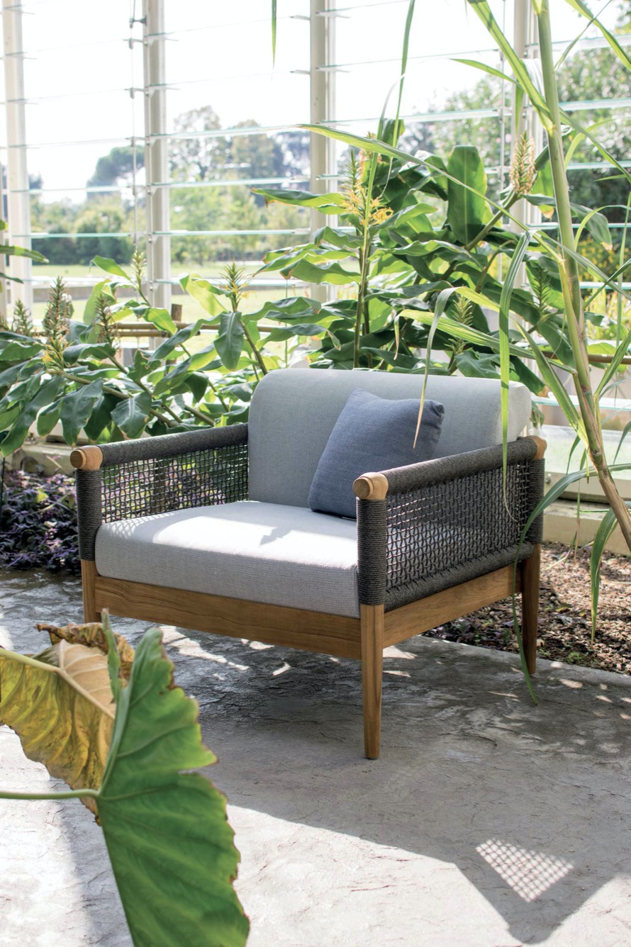 Design pulito e minimale descritto in una struttura completamente in teak intrecciata da una corda rotonda che crea una maglia morbida e di forte tenuta. Un nido accogliente diventa spazio di conversazione e lettura.