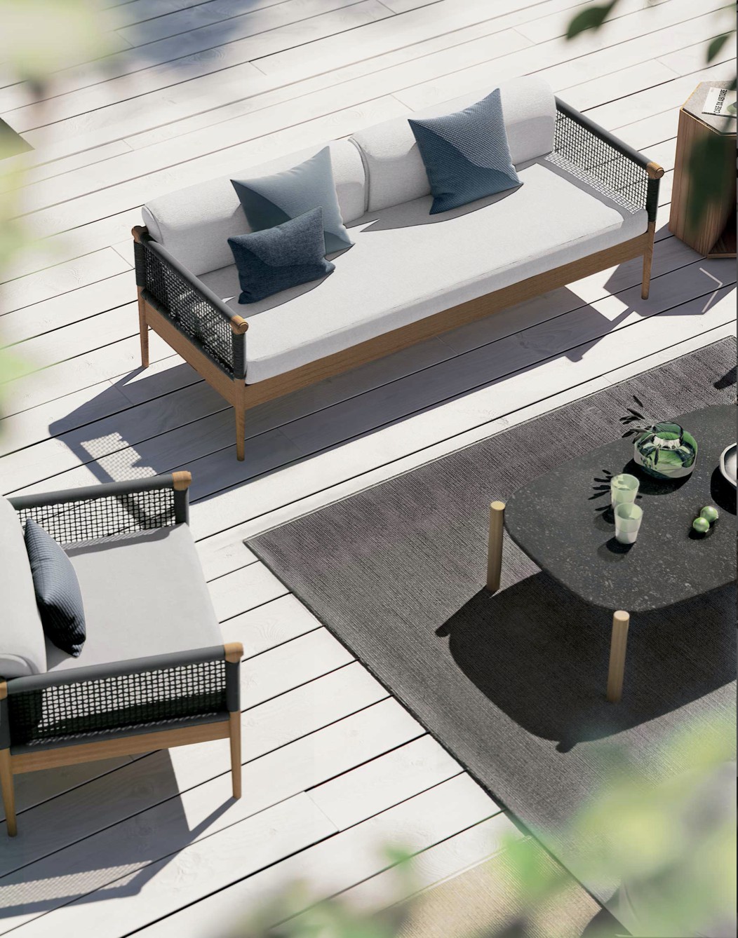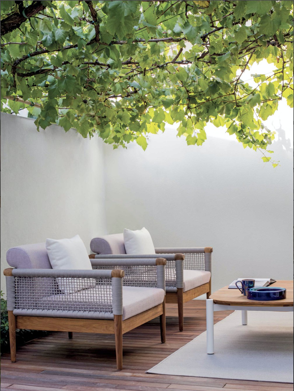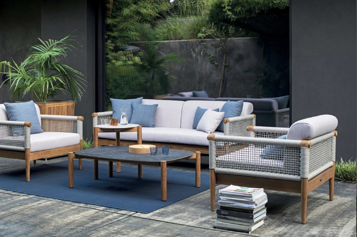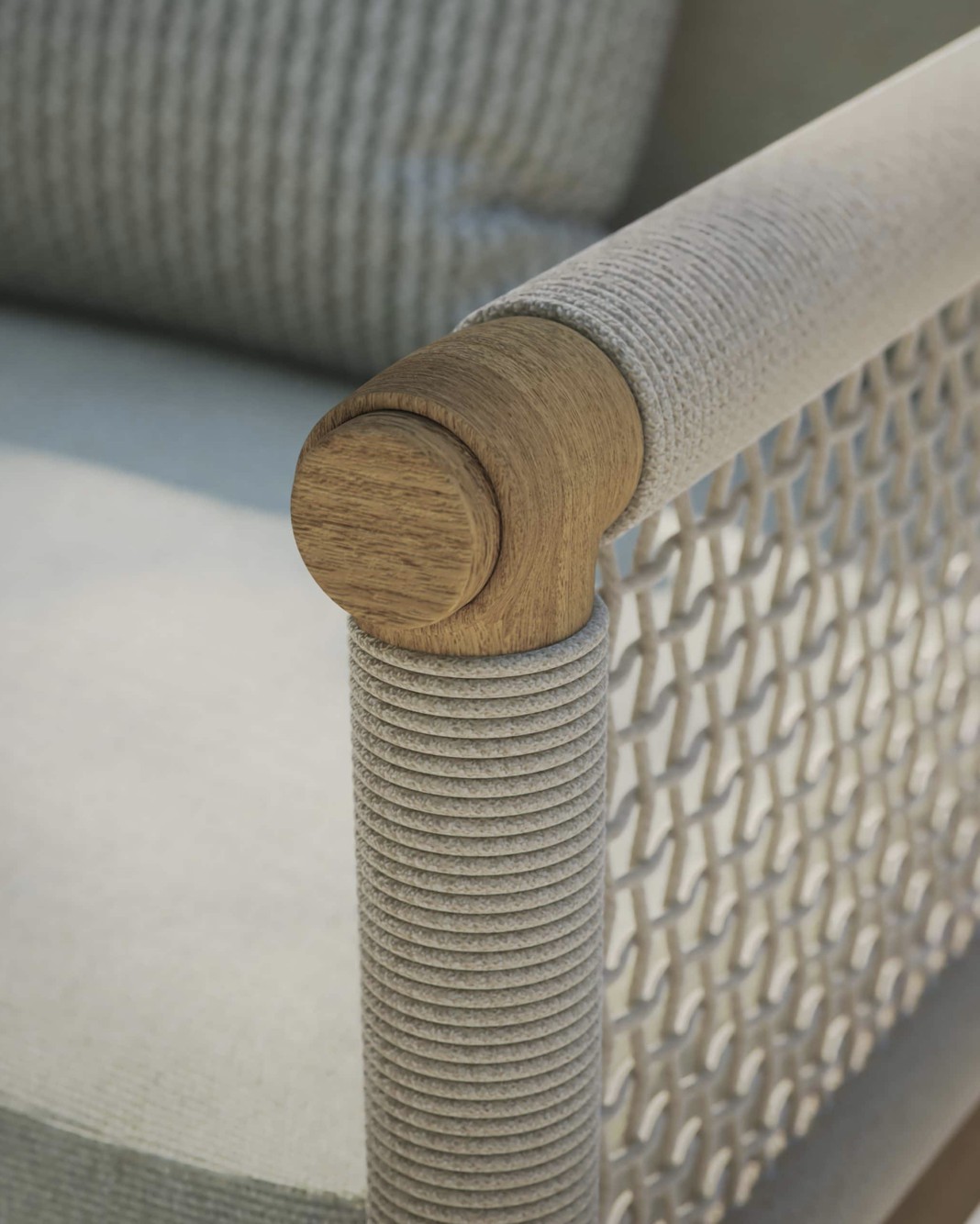 Design pulito e minimale descritto in una struttura completamente in teak intrecciata da una corda rotonda che crea una maglia morbida e di forte tenuta. Un nido accogliente diventa spazio di conversazione e lettura.