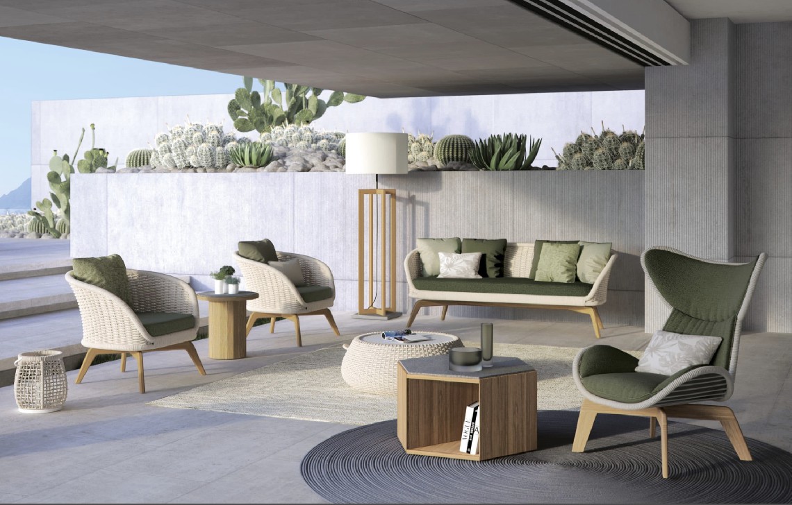Divano con base in teak abbinata a corde intrecciate a mano in fibra acrilica di Teflon, a sezione tonda, resistenti all’acqua e di facile pulizia. Il materiale presenta un appeal morbido e raffinato simile ad intrecci tessili. Si caratterizza per la sua resistenza ai raggi UV e per la velocità di asciugatura.