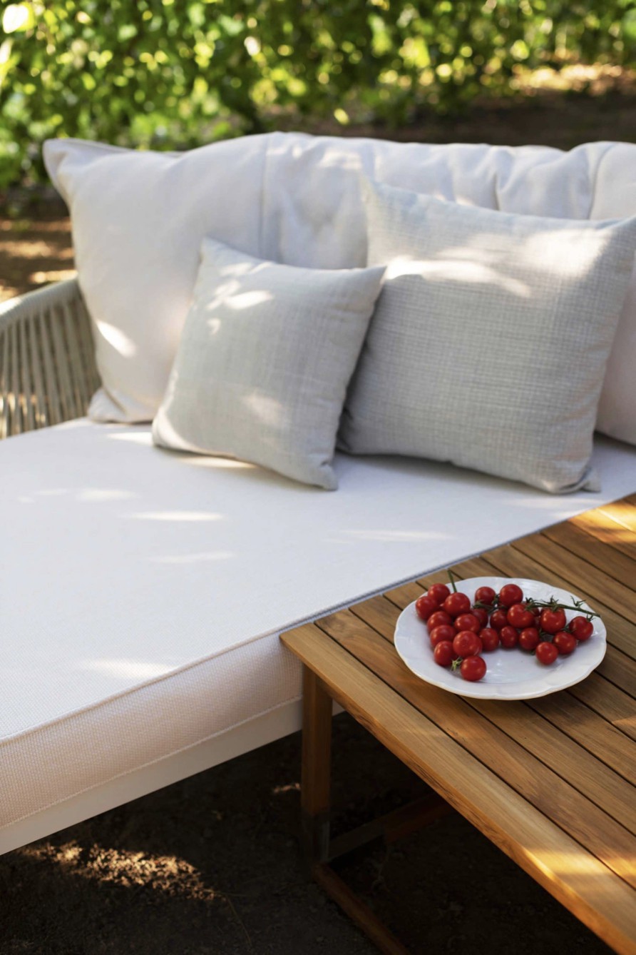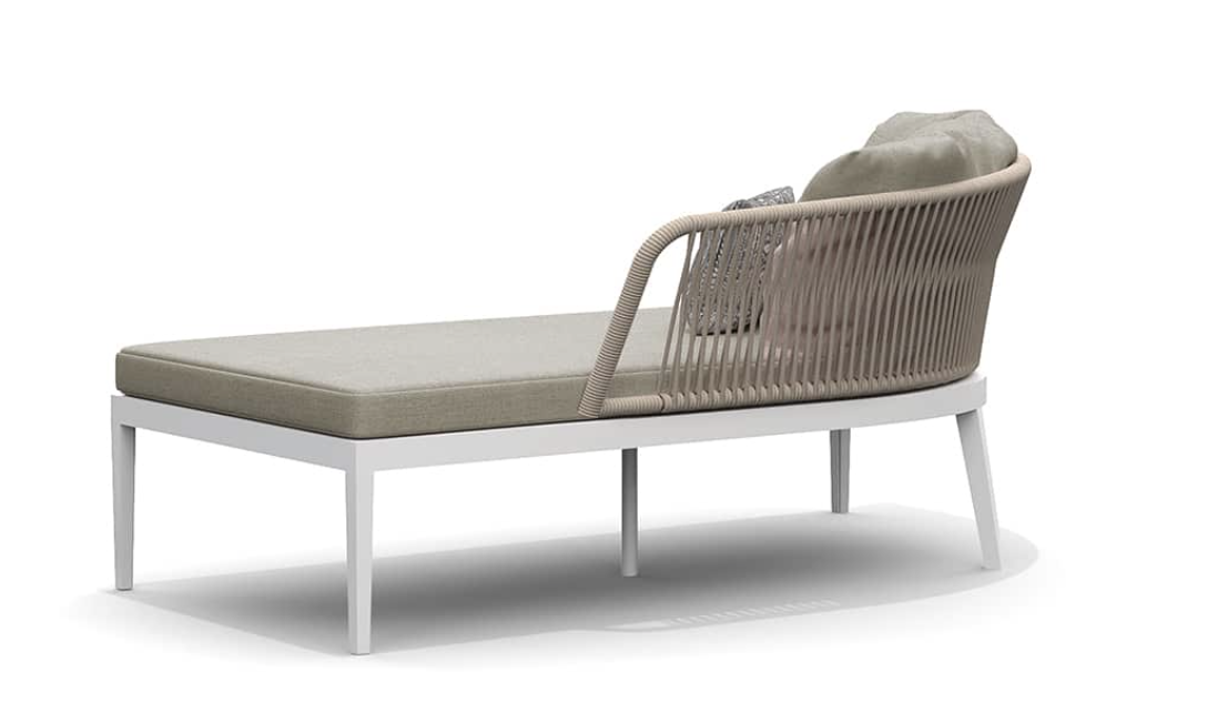 Un carattere signorile ed elegante cela un’anima minimale e giocosa. Fibre tessili sfumano in gradevoli nuances di verdi salvia e oliva che modellano forme morbide e ergonomicamente confortevoli. Una struttura in alluminio bianco o grafite risolve il problema degli spazi ibridi tra in e out coniugando molteplici soluzioni di arredo.