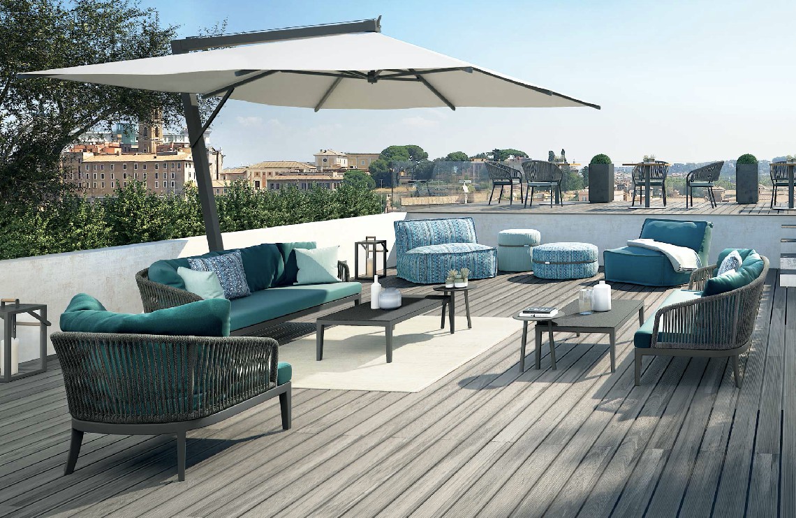 Un carattere signorile ed elegante cela un’anima minimale e giocosa. Fibre tessili sfumano in gradevoli nuances di verdi salvia e oliva che modellano forme morbide e ergonomicamente confortevoli. Una struttura in alluminio bianco o grafite risolve il problema degli spazi ibridi tra in e out coniugando molteplici soluzioni di arredo.