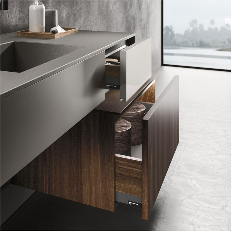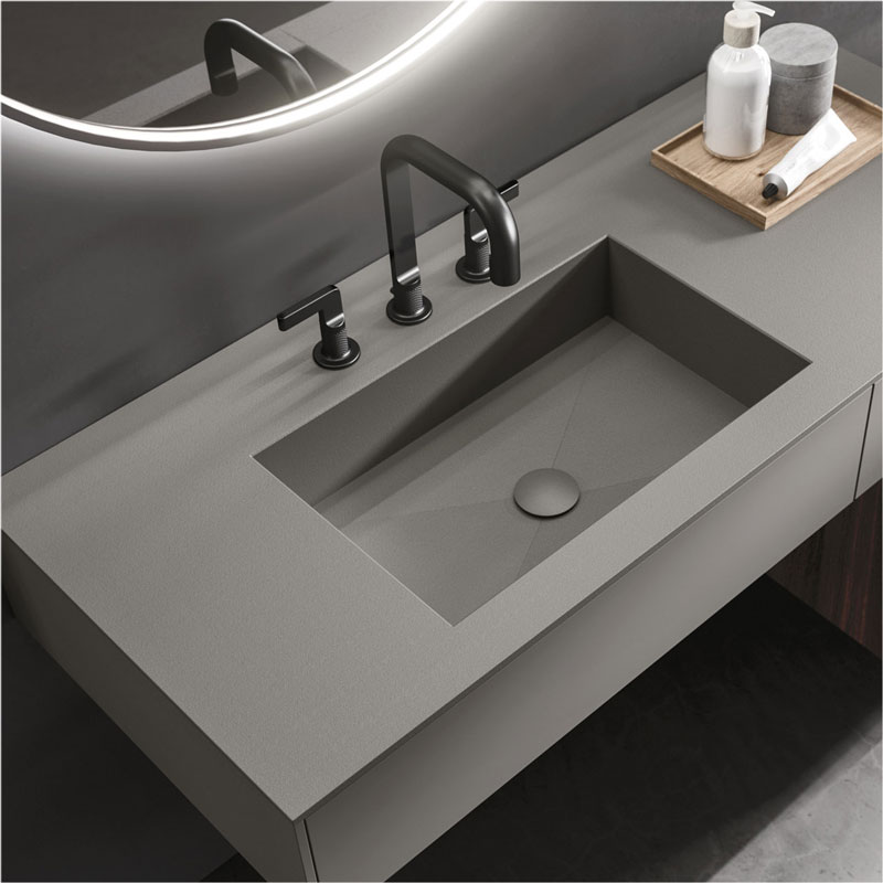 The painted metal top houses the Rettangolo basin with matching drain piece, in coordination with the Sand Grigio Londra lacquered fronts.