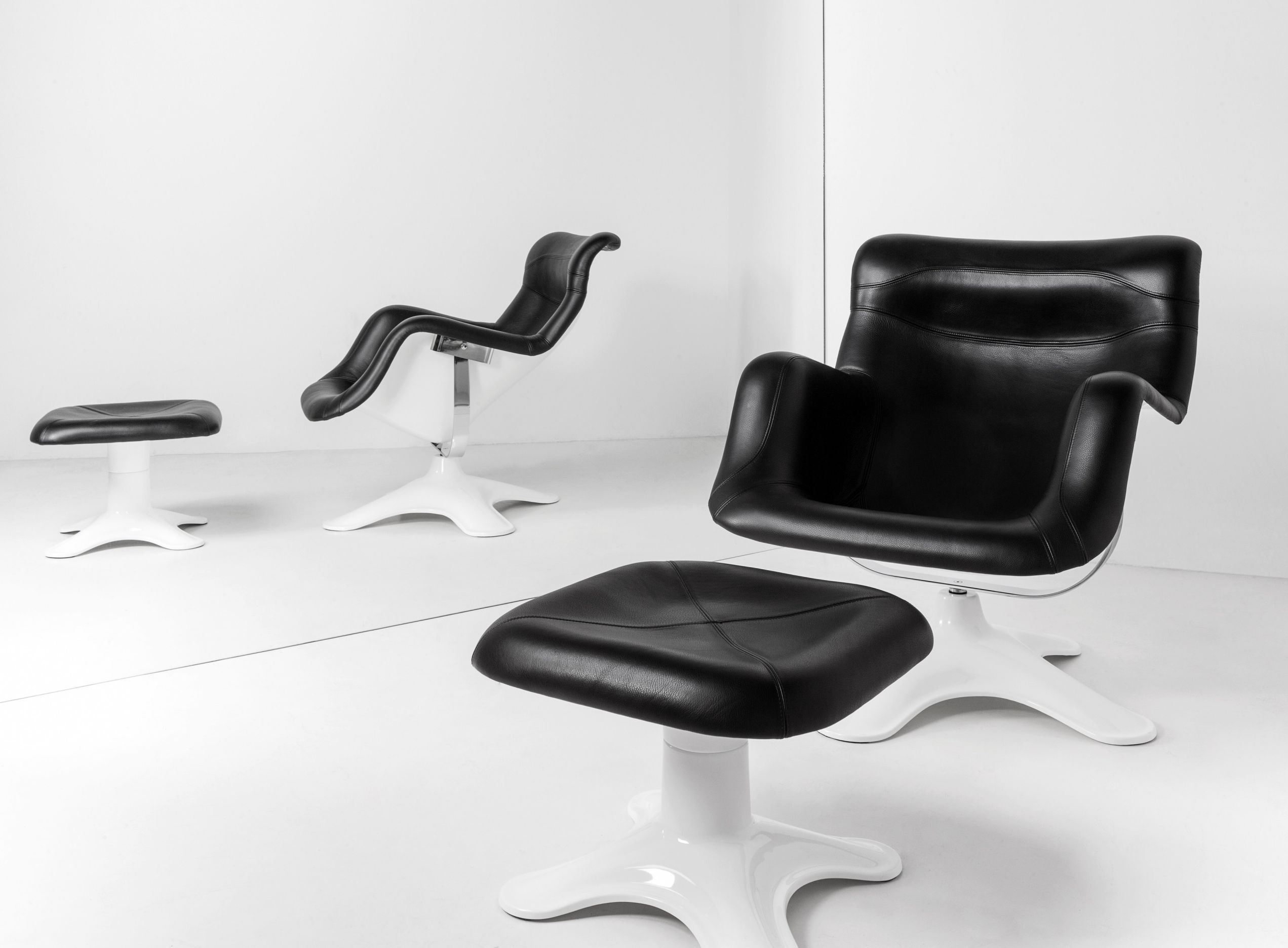 Karuselli Ottoman是Karuselli休閑椅的陪伴者,也是設(shè)計(jì)師Yrj?Kukkapuro對(duì)功能,人體工程學(xué)和有機(jī)形式的完美結(jié)合帶來終極舒適感的延續(xù)。 矮凳由位于白色玻璃纖維底座上的軟墊皮革上衣組成。