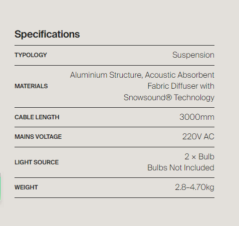 The patented Snowsound Fiber textile lends the lamp out- standing soundabsorbing qualities and acoustic performance.
