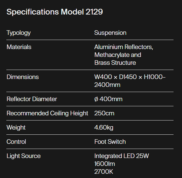 The intimate light provided by Model 2129 wraps the space in a warm ambience. The luminaire features a discreet counterweight and a large arc-shaped arm in transparent methacrylate that is attached to the ceiling and able to rotate 360 degrees horizontally. The cup-shaped reflector is made of two lathed aluminium pieces painted white and caviar grey. Both the dowel for the ceiling fitting and the counterweight are made of painted brass.