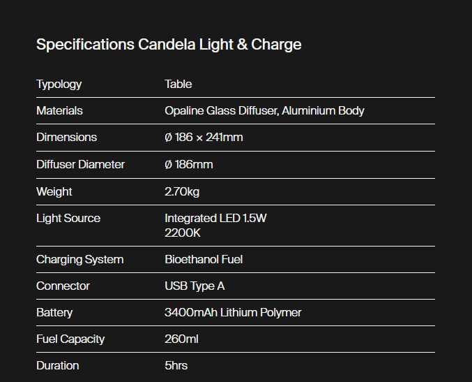 For Candela, Astep has crafted a novel energy harvesting system that generates electricity from the heat of the flame thanks to the thermoelectric Seebeck effect. Powered by bioethanol, a clean, natural and renewable fuel made from plants, Candela produces it’s own electricity to provide cosy LED illumination, and charge mobile devices via USB.
